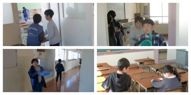新年度を迎えるにあたり、4年生が教室の移動を行っていました。新しい教室へ荷物をもって向かう