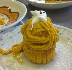 焼いたスポンジに、裏ごししたかぼちゃを使ったクリームをいっぱい塗って、
