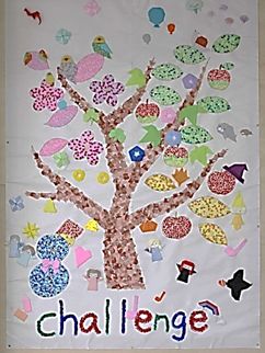 チャレンジ教室歌「わたしたち」の歌詞をモチーフに、ちぎり絵で「リンゴの木」を創り、