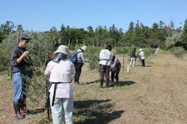 「三里浜オリーブカルメリーナ」では、オリーブの手摘み収穫と選別を体験し、