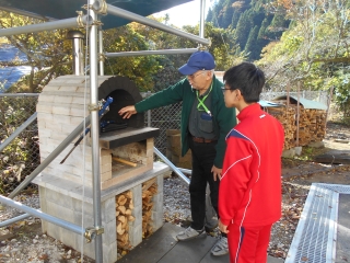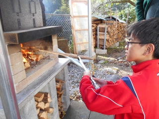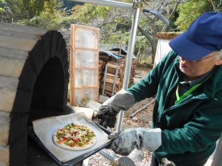 最初にピザ釜に火を焚き、丹尾さんに薪の様子を見てもらっている間に、調理室で野菜を切って具材をトッピング。