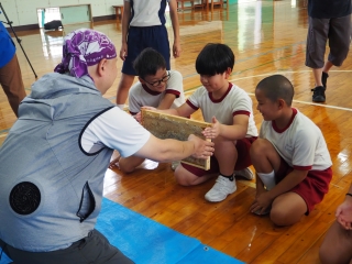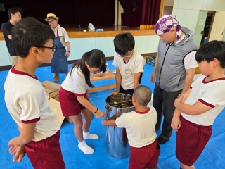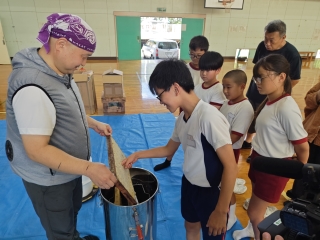 学校に戻り、長橋小の友達を迎え、佐々木さん、橋本さんのご協力のもと、遠心分離機を使ってはちみつをしぼりました。