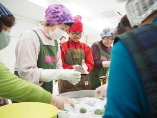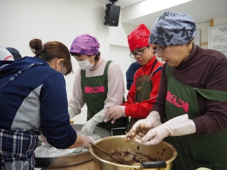 公民館で、道草だんごの会の皆さんに教えていただきながら、草だんご作りと、杵と臼を使った本格的な餅つきに挑戦しました。