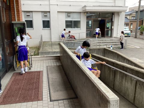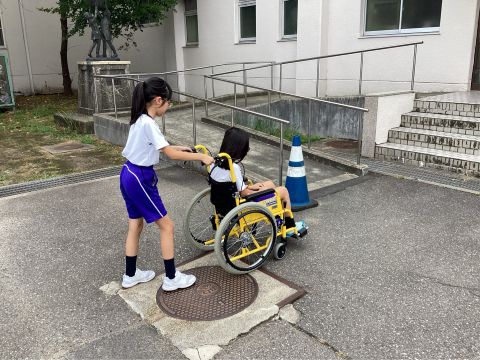 身の回りにあるユニバーサルデザインやバリアーフリーについて学んだり、実際に車椅子に乗る体験をしたりしました。