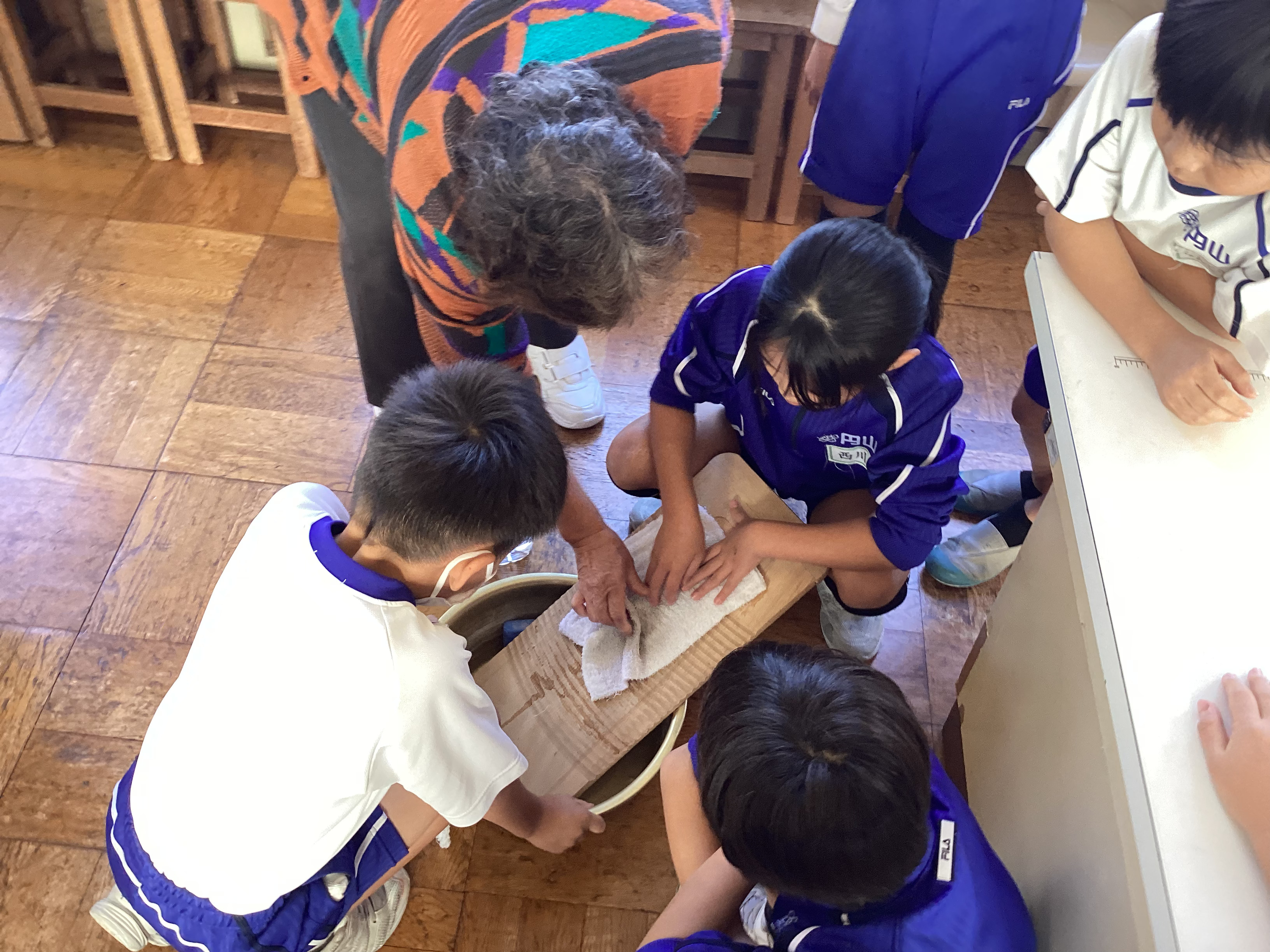 昔の生活については、昔の洗濯の仕方についてのお話を伺い、実際に洗濯体験も行いました。