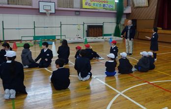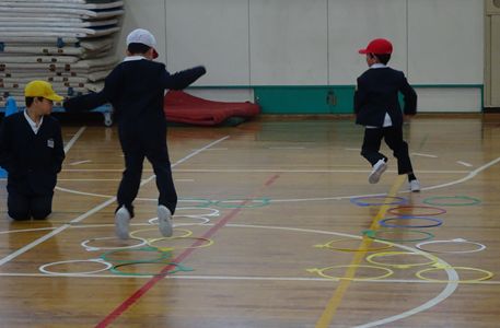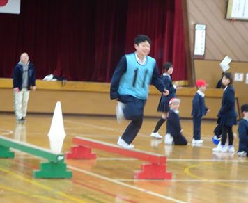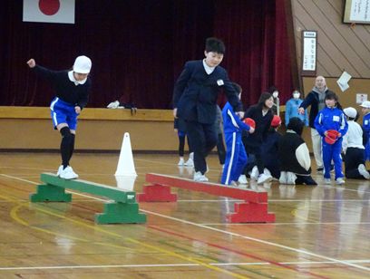 大休の時間に、体育館で障害物競走をリレーして行います。