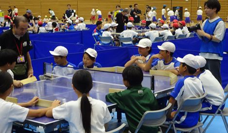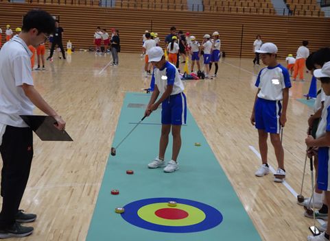 東藤島小学校児童は、まず、ニュースポーツである「スティックリング」と「卓球バレー」を体験しました。