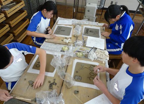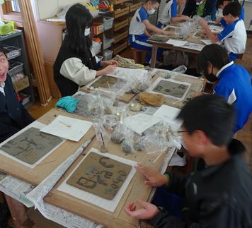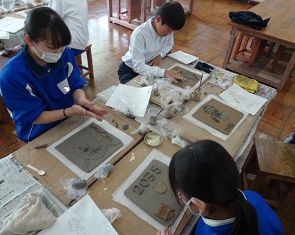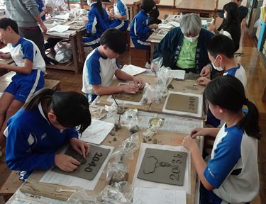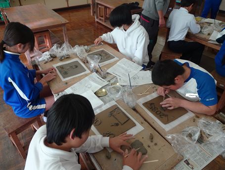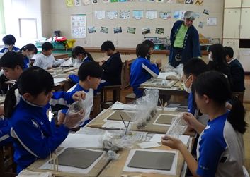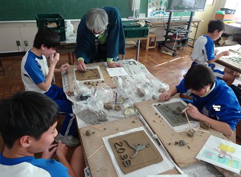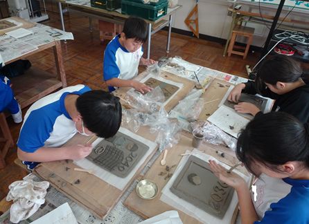 その下絵を設計図として、焼くと色の変わる粘土を工夫しながら幾重にも重ねて熱心に作成していきました。