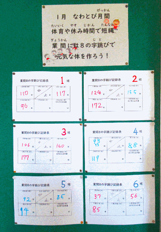 | 今日もかなり冷えました。それでも子ども達は元気です。大休みには 縦割り班で大縄を使った「8の字とび」に取り組んでいます。 今月末には「8の字とび大会」も予定している |