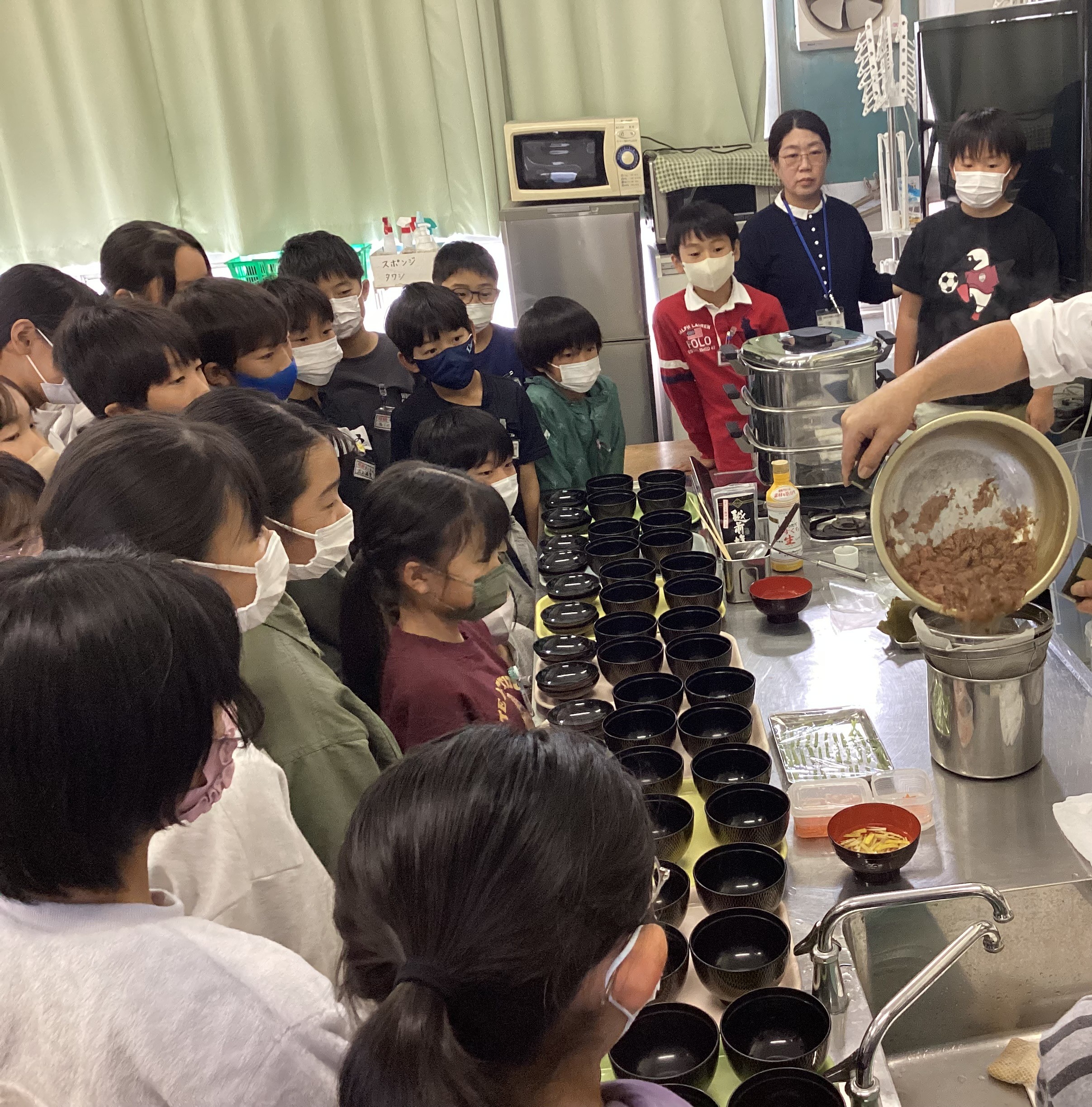 | 家庭科の学習で調理実習をしました。 校外学習で行う飯ごう炊さんの練習もかねて、ご飯をお鍋で炊いておにぎりをつくりました。 調理計画を確認しながら準備し、透明な鍋でご飯が |