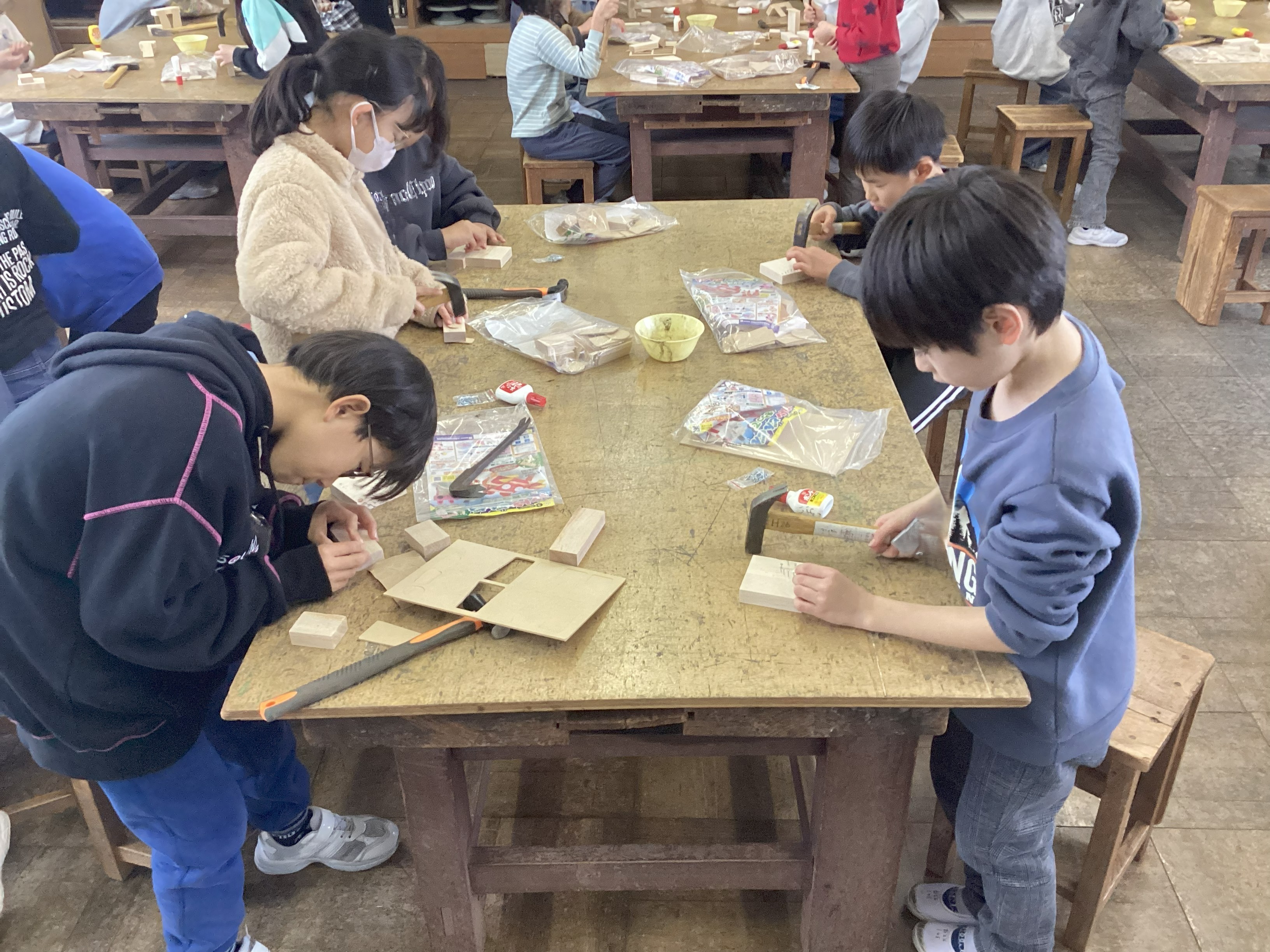 「曲がっちゃった。」「上手に打てた。」など初めて体験する釘打ちに、上手にできるまで何度も挑戦する姿が見られました。
