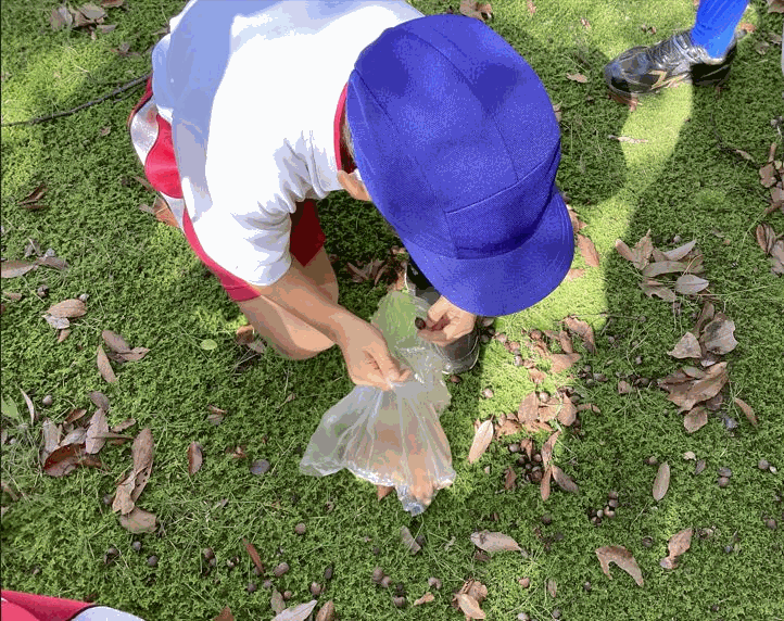 いろいろな種類のどんぐりがたくさん落ちていて、子どもたちは夢中で拾っていました。持ってきた袋がいっぱいになっている子もいました。