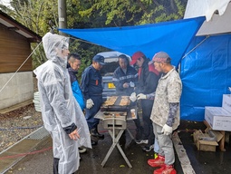 焼き鳥の模擬店を出店しています。午前中があいにくの雨であったため、文殊こども太鼓