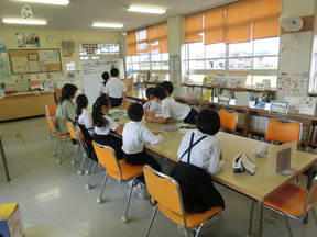 | 2年生が町探検に出かけました。行き先は文殊公民館です。 いつもお世話になっている公民館長さんからお話を聞かせてもらい、 館内の見学もさせてもらいました。 みんな自分のタブ |