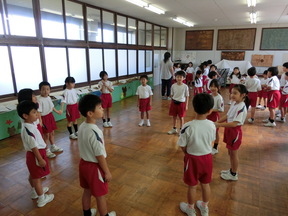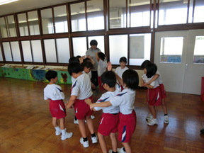 | 文殊の火祭りが明後日に近づいてきましたが、本日の文殊っ子タイムでは、 校内スポーツフェスティバルで行う縦割り競技「水汲みリレー」の練習を 行いました。屋内での練習でした |