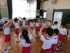 | 「文殊の火祭り」では、文殊地区で受け継がれている「文殊音頭」を 全員で踊ります。 今日は、2年生のみなさんが1年生に教えるために練習をしていました。 教え方についてグルー |