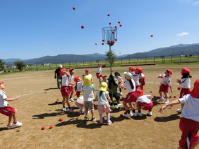 玉入れの競技をします。今日は、一緒にダンスと玉入れの練習をしました。