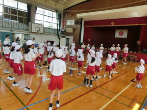 | 文殊の火祭りが明後日に近づいてきましたが、本日の文殊っ子タイムでは、 校内スポーツフェスティバルで行う縦割り競技「水汲みリレー」の練習を 行いました。屋内での練習でした |