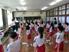 校内スポーツフェスティバルに向けて、初めて全校児童で応援練習をしました。
