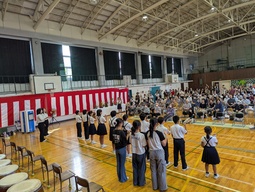 | 「文殊の火祭り」では、文殊地区で受け継がれている「文殊音頭」を 全員で踊ります。 今日は、2年生のみなさんが1年生に教えるために練習をしていました。 教え方についてグルー |