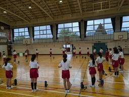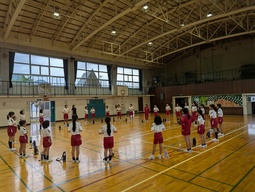 | 文殊の火祭りが明後日に近づいてきましたが、本日の文殊っ子タイムでは、 校内スポーツフェスティバルで行う縦割り競技「水汲みリレー」の練習を 行いました。屋内での練習でした |