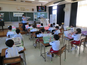 夏休み前の全校朝礼を行いました。 熱中症対策のため、体育館ではなくエアコンが効く交流ルームでの 全校朝礼としました(全校児童が入れてしまいます)。 書写の表彰と、夏休みに