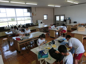 | 夏休み前の全校朝礼を行いました。 熱中症対策のため、体育館ではなくエアコンが効く交流ルームでの 全校朝礼としました(全校児童が入れてしまいます)。 書写の表彰と、夏休みに |