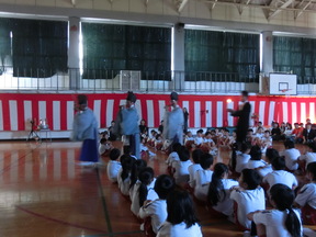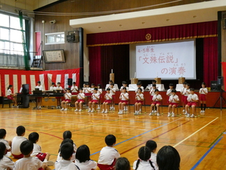 各学年の発表。写真は4・5年生による「文殊伝説」の合奏の様子です。
