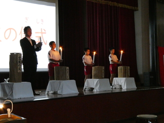 体育館での「採火の儀式」。PTA会長が文殊の火を運びます。