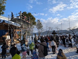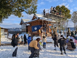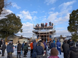 社殿の前に足場を組んで、その上からだんごやお菓子、みかんなどをまきます。