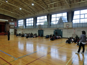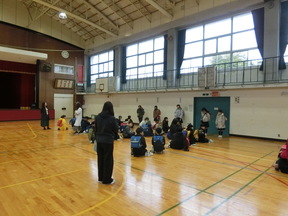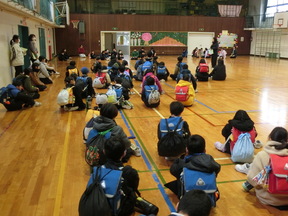 今日の下校前に、体育館で今年度最後の町内児童会を行いました。