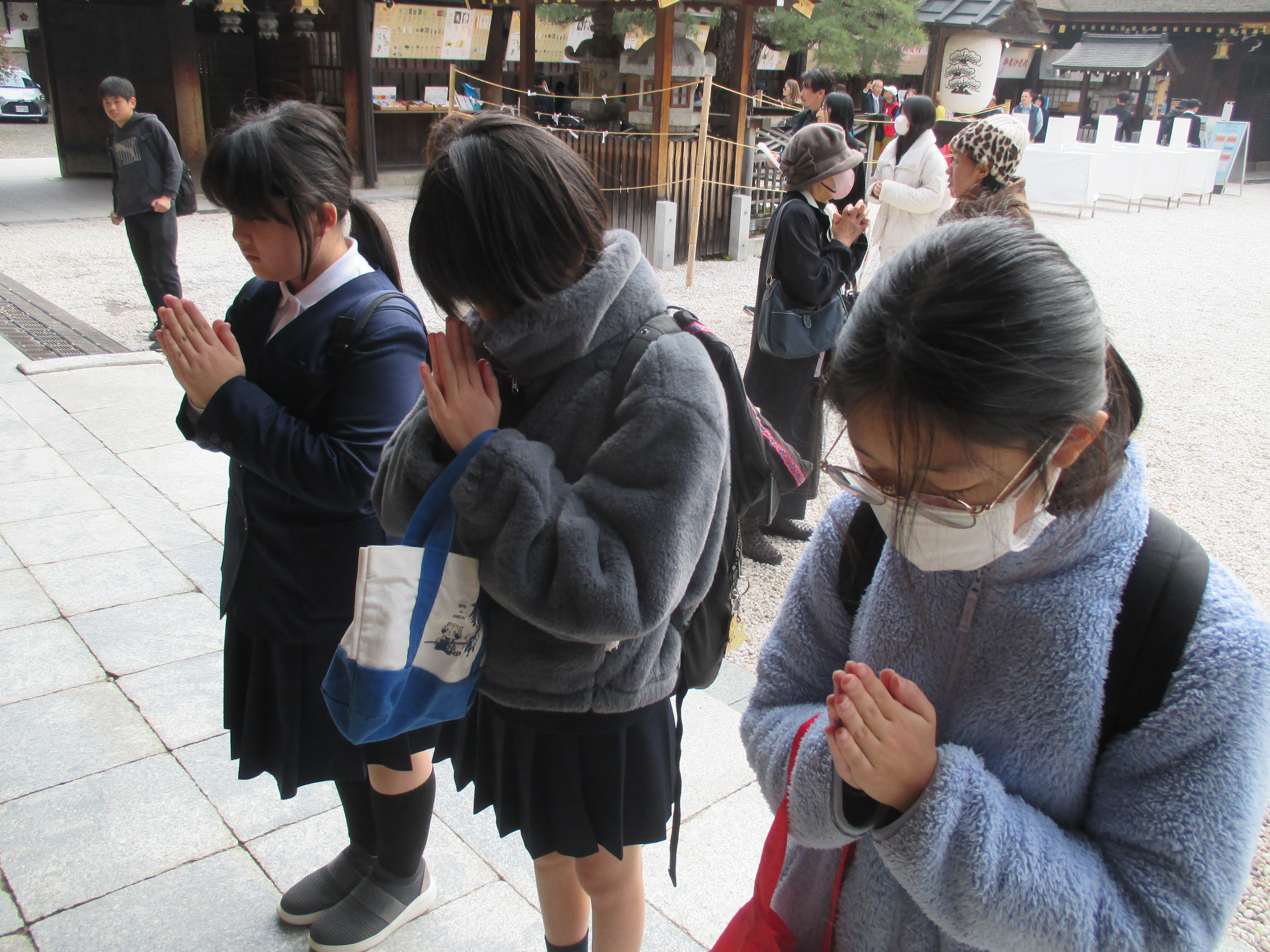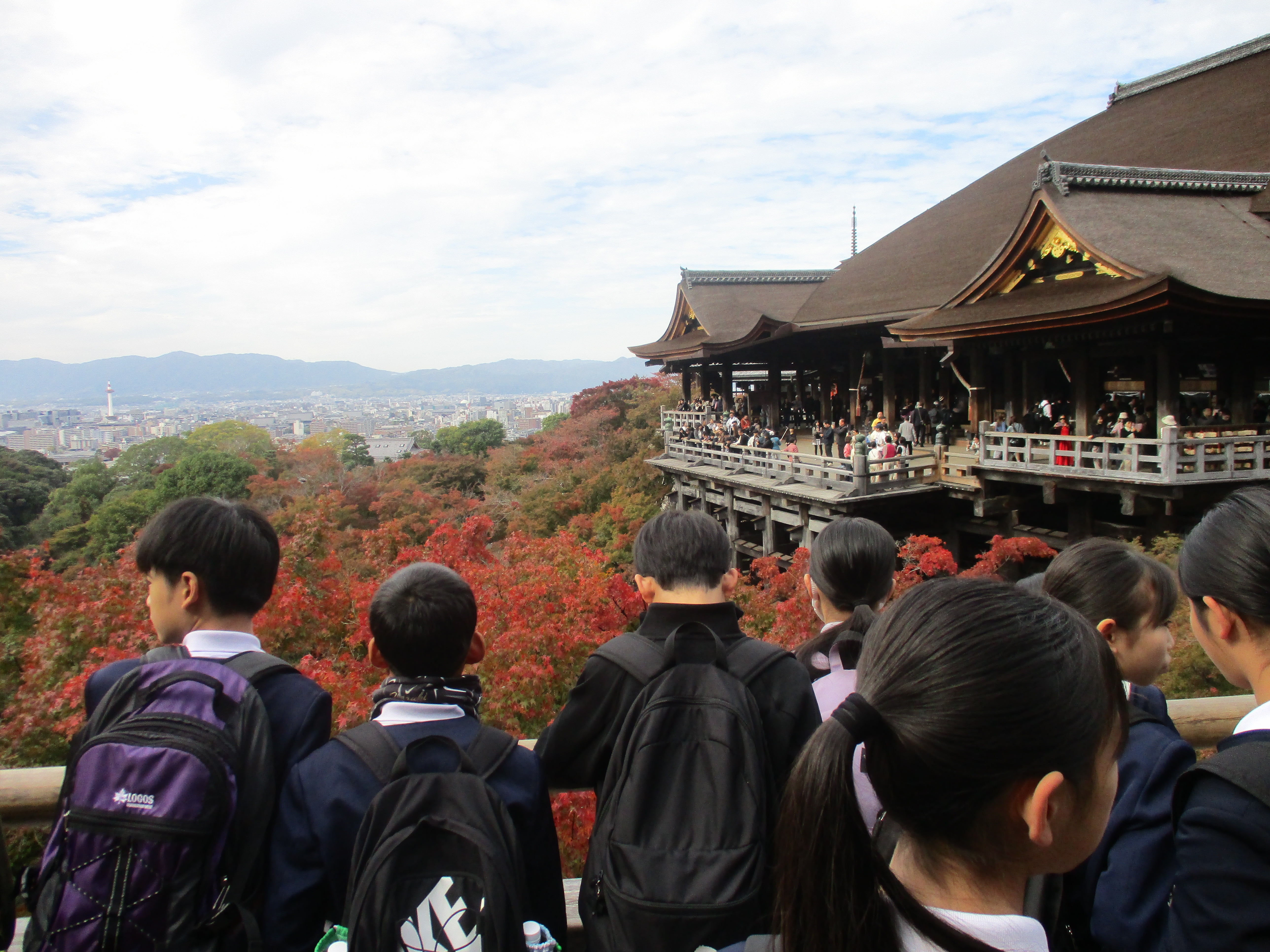薄曇りの秋の日、6年生が修学旅行のため、関西方面に向けて出発しました。京都では、平安神宮を起点にタクシーで班別学習を行いました。二条城や金閣寺、清水寺など、自分たちで決めた見学先に散っていきました。コース上、昼食も自分たちで決めて摂りました。バスで移動して着いた奈良では、ボランティアガイドさんとともに、東大寺大仏殿や二月堂などを見学しました。宿舎のあ る大阪に着く頃には、辺りは暗くなっていました。