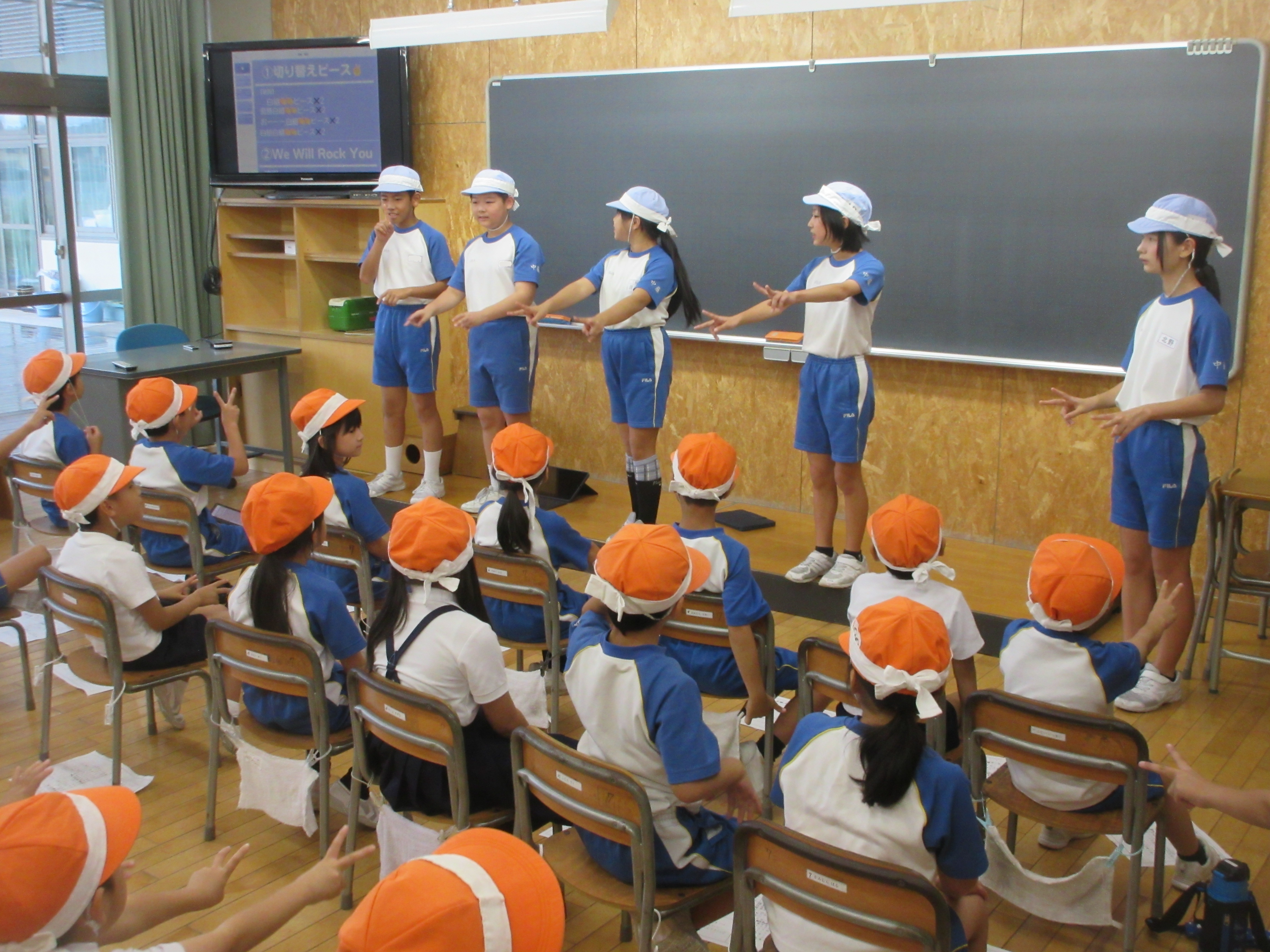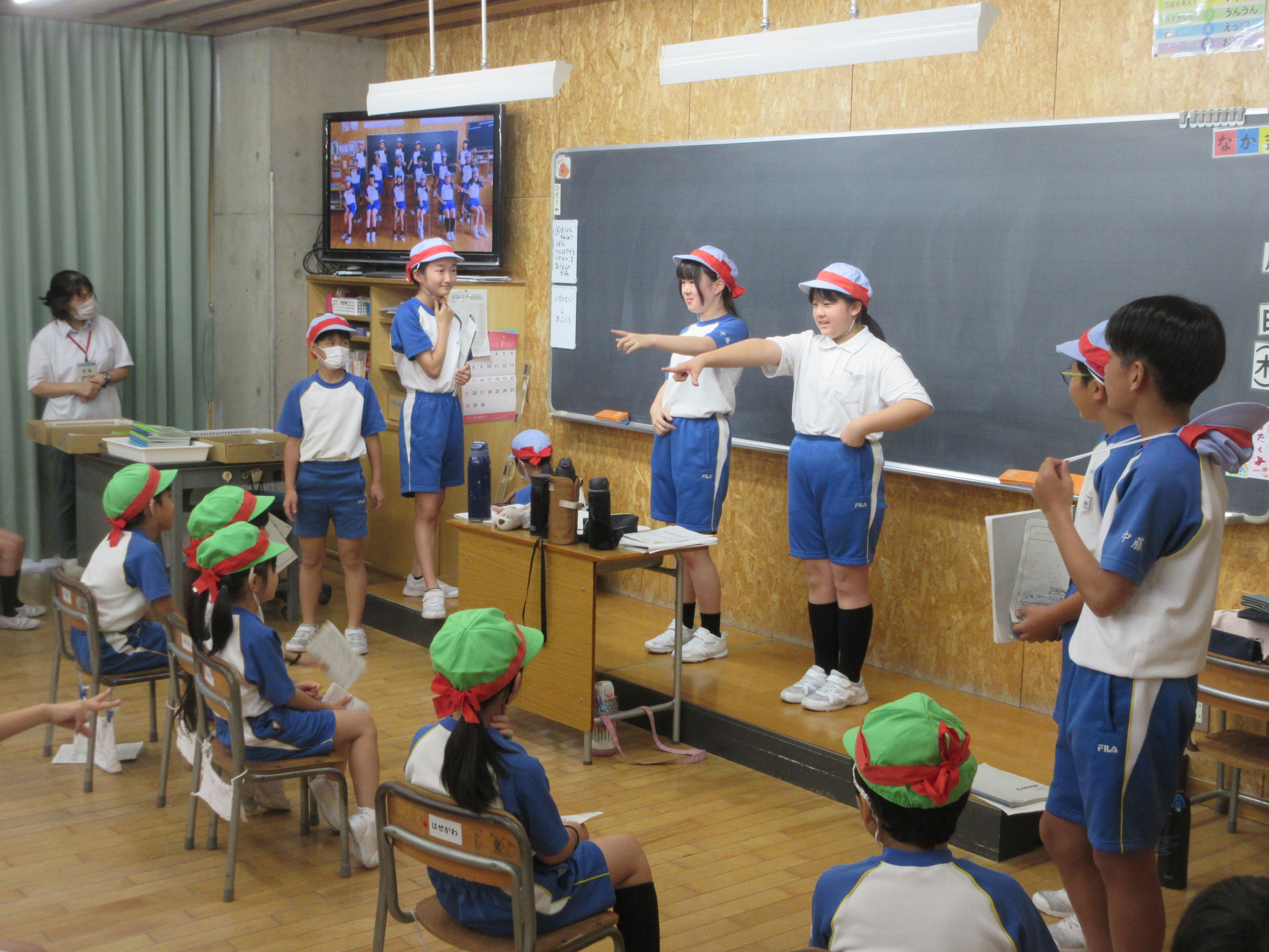 なかよしタイムは、6年生が各学年の教室に分散して、応援のレクチャーをしました。これまでの体育大会では、色別パフォーマンスで色ごとにダンスを披露していましたが、今年度は応援合戦を復活させました。入学以来初めてという学年も多く、その指導に6年生も苦労していたよう です。何回か練習を重ね、大会では自信をもって披露してもらいたいです。