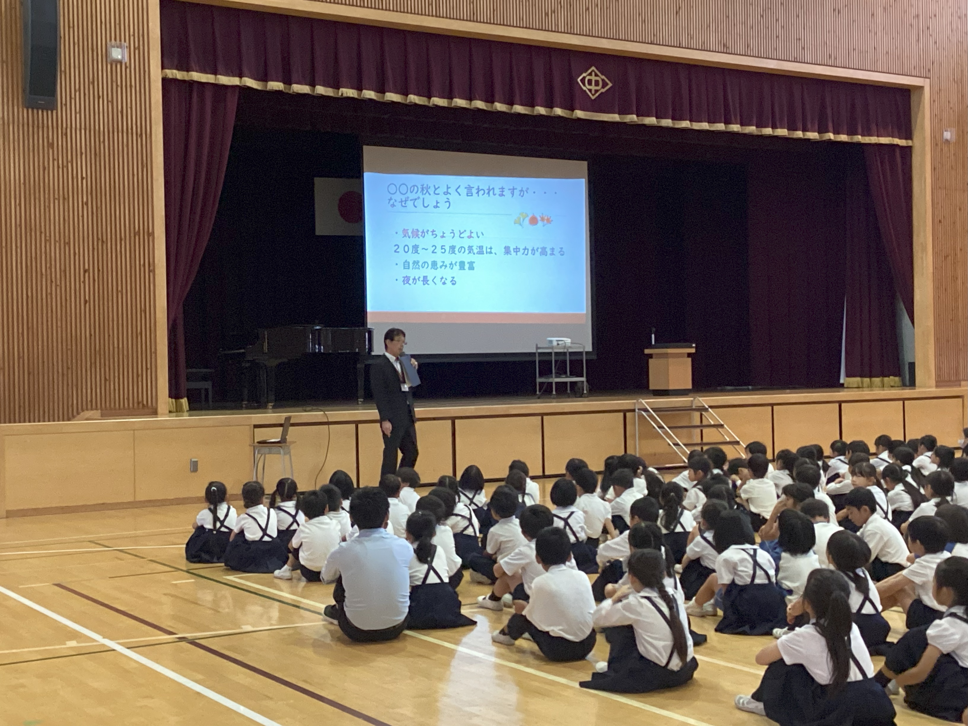 5日間の秋季休業を終え、2学期始業式がありました。式の話では、○○の秋に因み、なぜいろいろな秋があるのか、理由を理解した上で、どんな秋を過ごすのか、児童に問いました。また、2学期は学年のまとめの学期であることも伝えました。充実した2学期にしてほしいと思います。