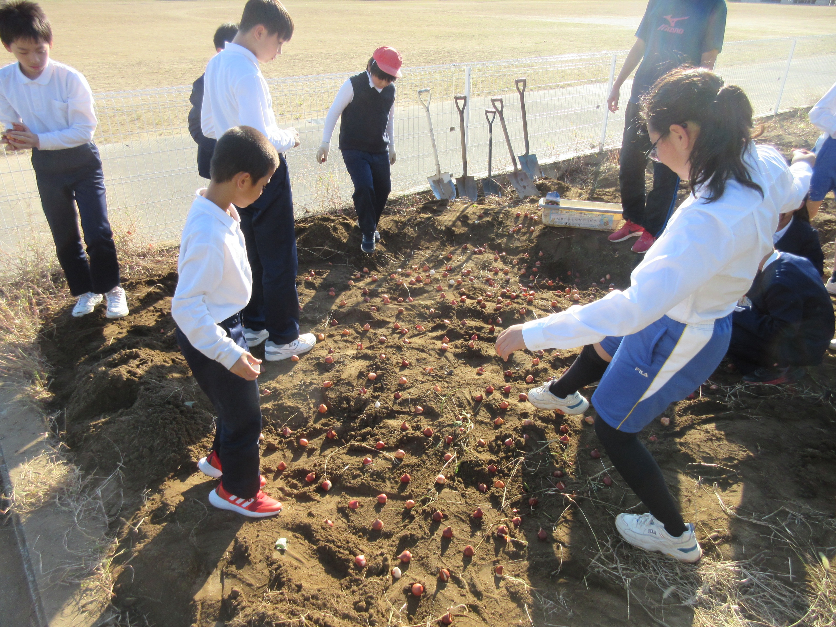 先日、富山県の八幡さんからいただいたチューリップの球根を、学園委員会の児童が学年園の一角とプランターに植えました。並べ方は、話し合いの結果、4月、赤・ピンク・黄色チューリップが混ざって咲くようにと決まり、球根は、バラバラに10cm掘り下げた地面に並べました。4月が待ち遠しいです。