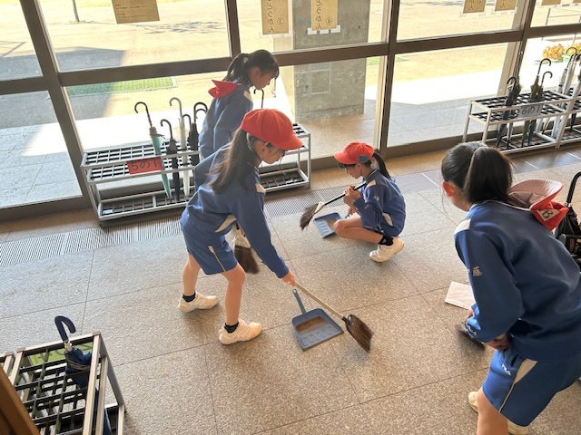 本校では、11月中旬から各学年ごとにマラソン大会が行われます。それに向けて体育の時間に練習を行っています。授業後、やっかいなのは外履きについた土砂の処理です。屋外玄関マットで靴底の砂を落としてはいるのですが、なかなか取り切れず玄関にたまる始末。今日は、5年生の有志がすすんで玄関掃除をしてくれました。ちょこっとボランティア、助かります。