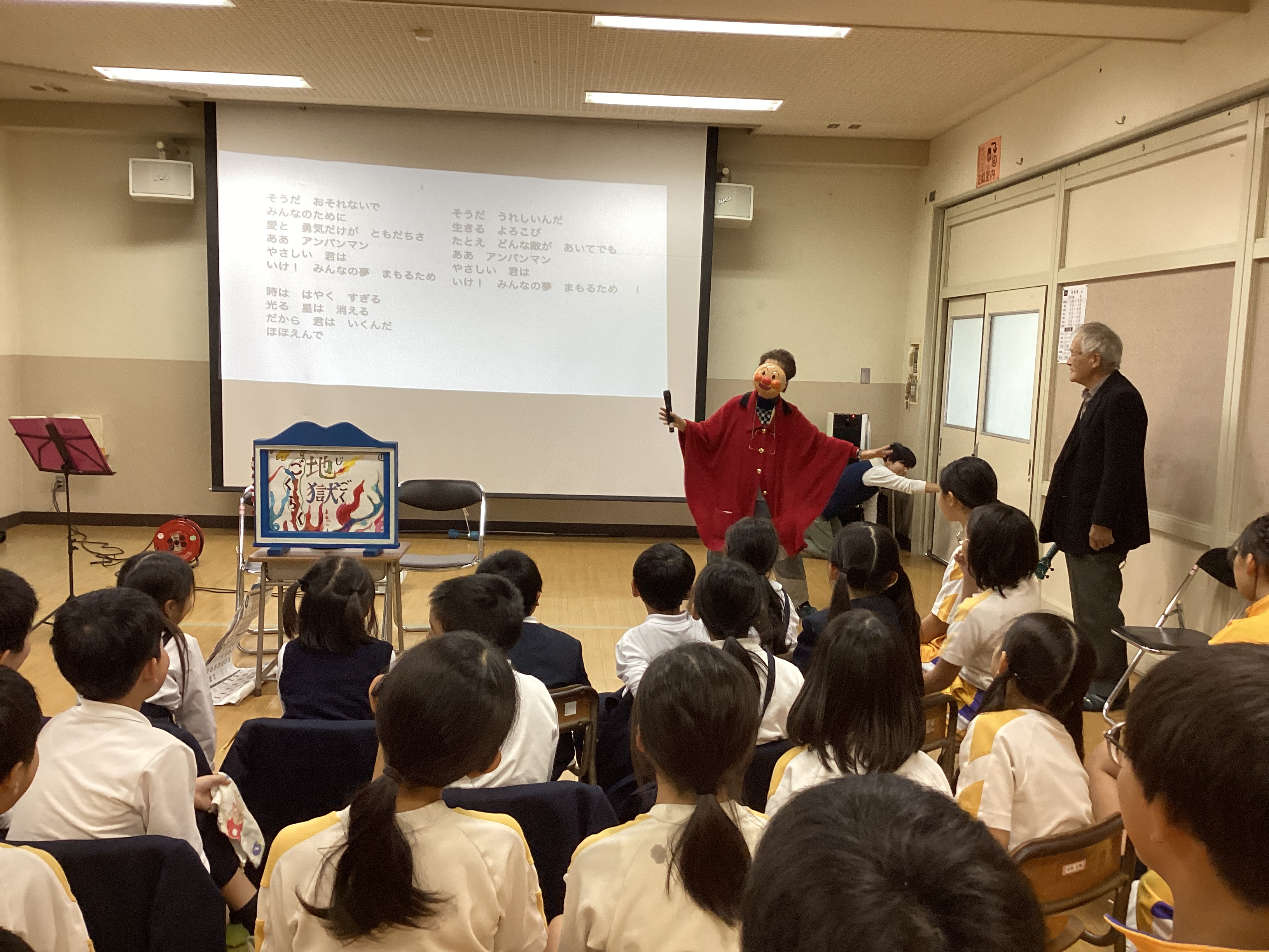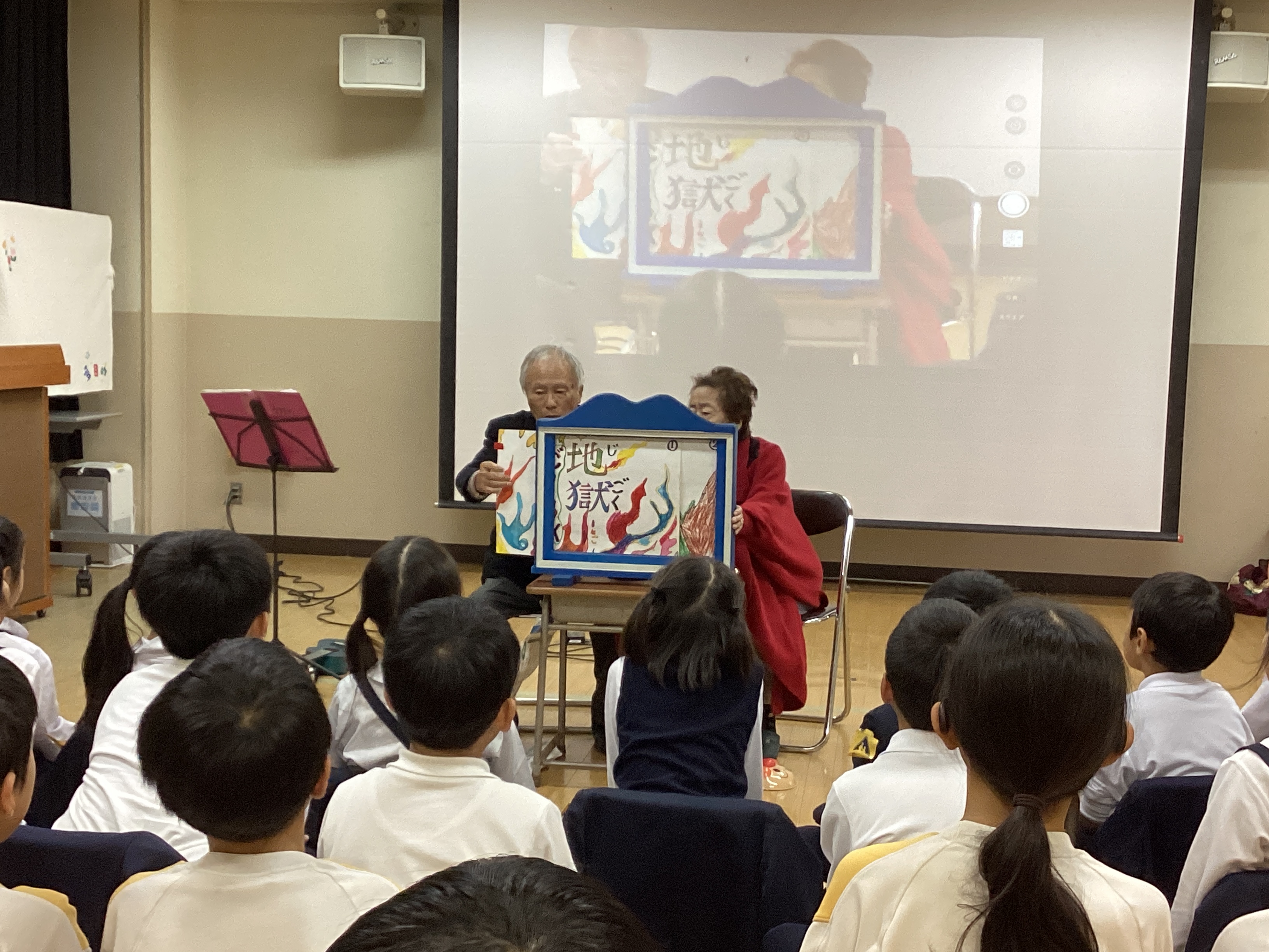 昔、棗子ども会の子どもたちが絵を描いた紙芝居「地獄ごくらく」や「アンパンマーチ」「しゃぼん玉」といった童謡を通した心のお話、そして昔の棗小学校の話をお聞きしました。