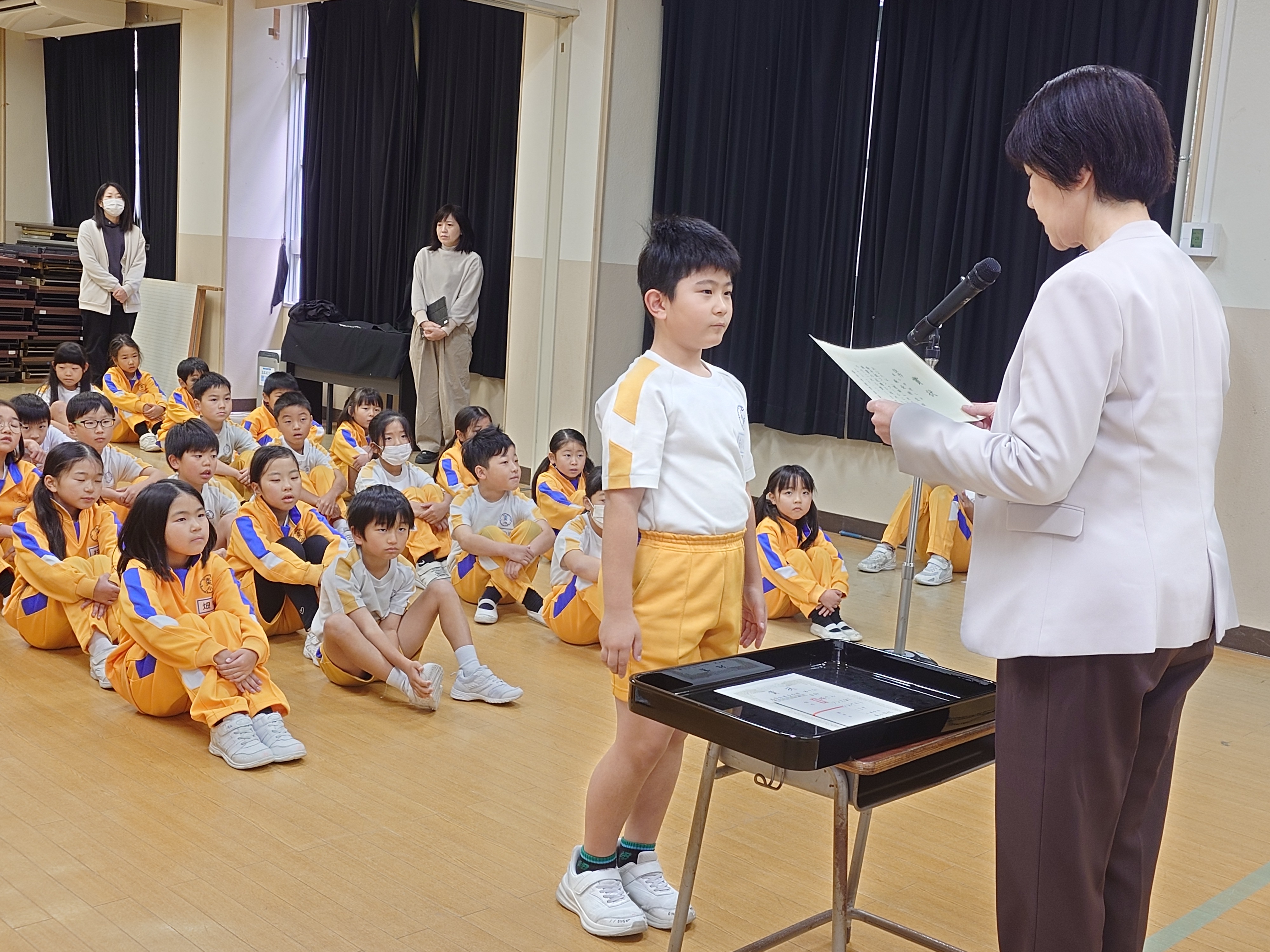 表彰では「家族ふれあい」絵手紙コンクールと校内マラソン大会の表彰が行われました。子どもたち、色々な所で頑張っています!