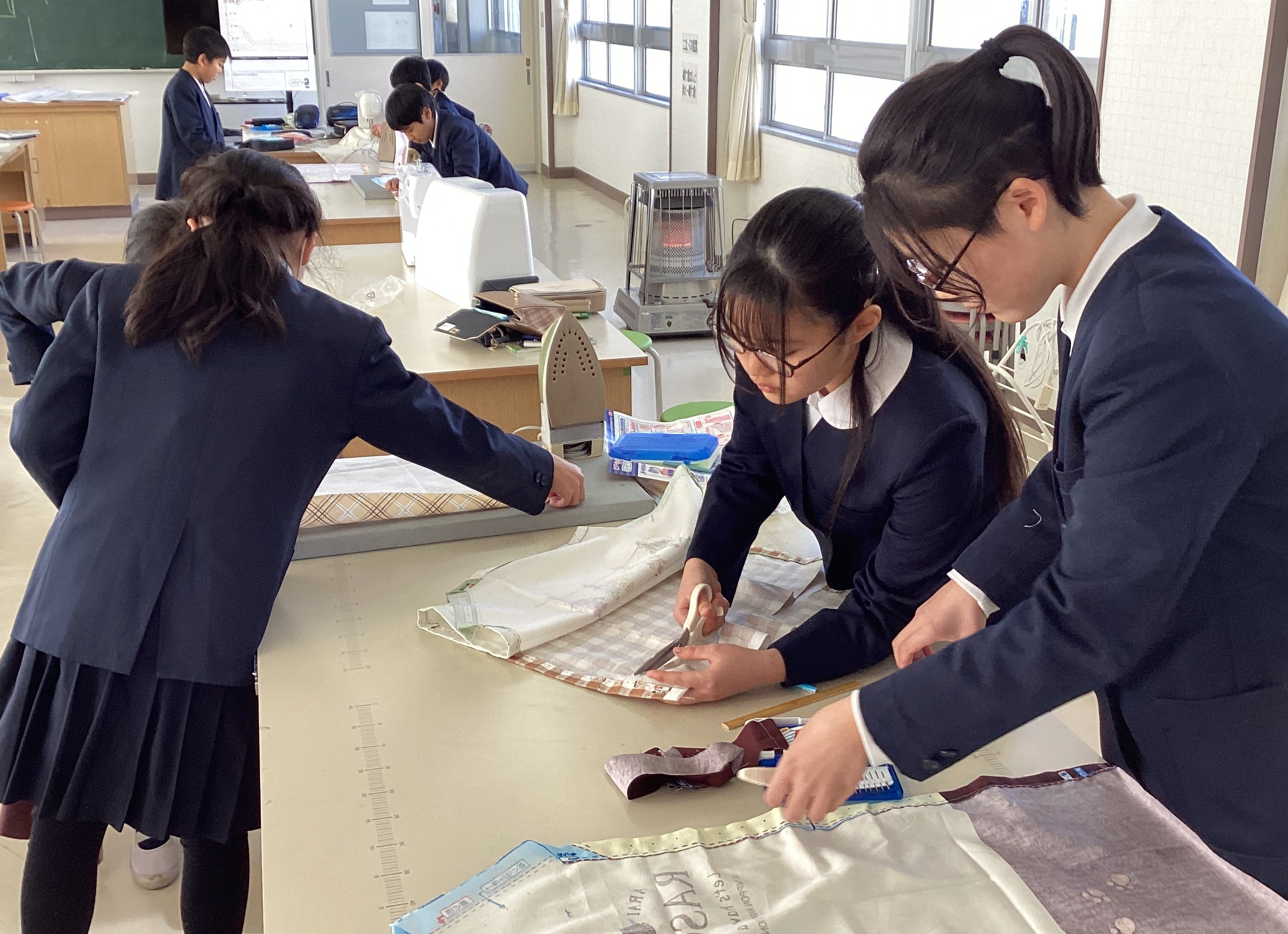 5,6年生の家庭科の時間です。今は、エプロン作りをしています。