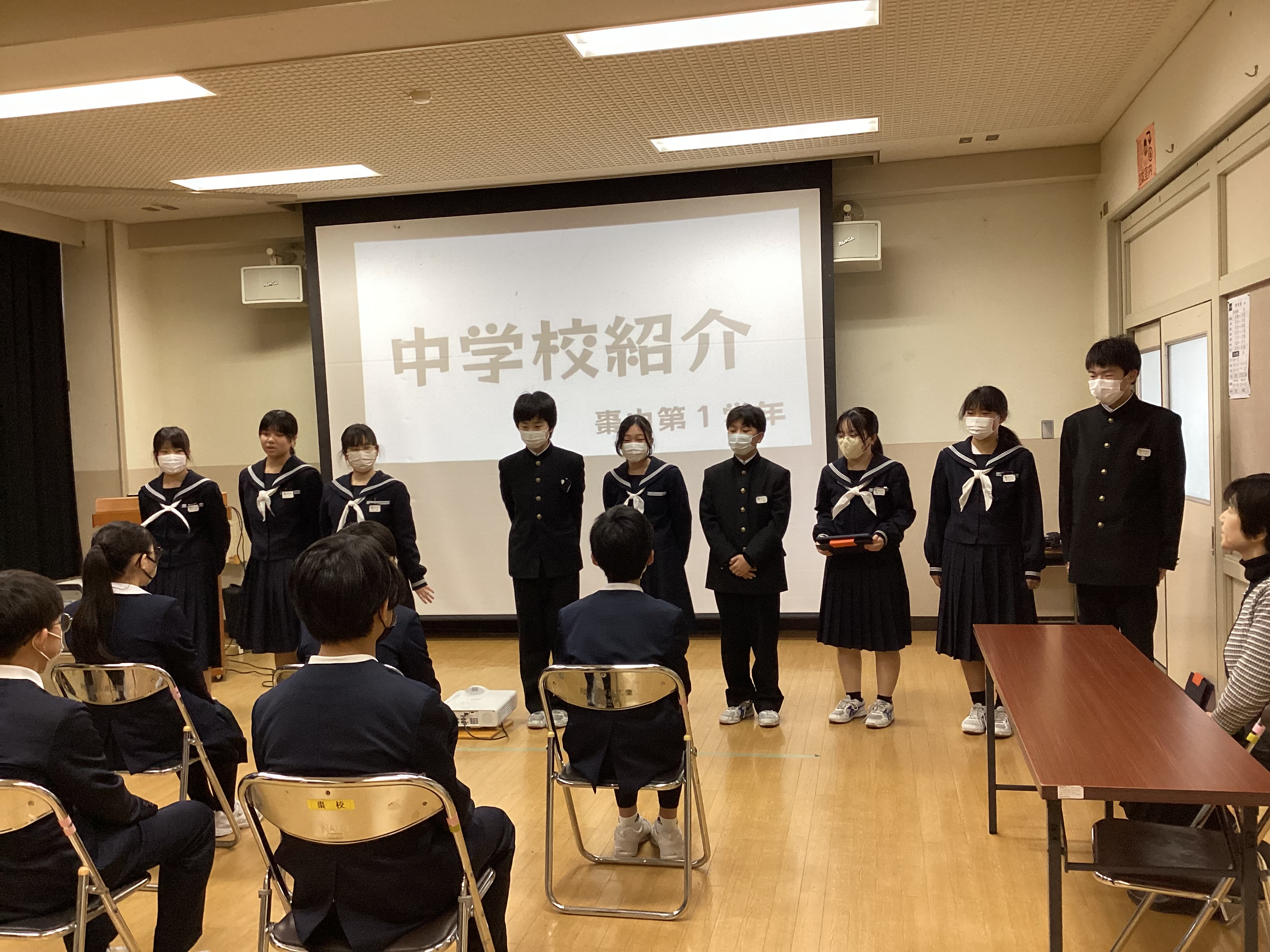 自分たちで作った中学校紹介のスライドを見せながら(ユーモアも交えながら)