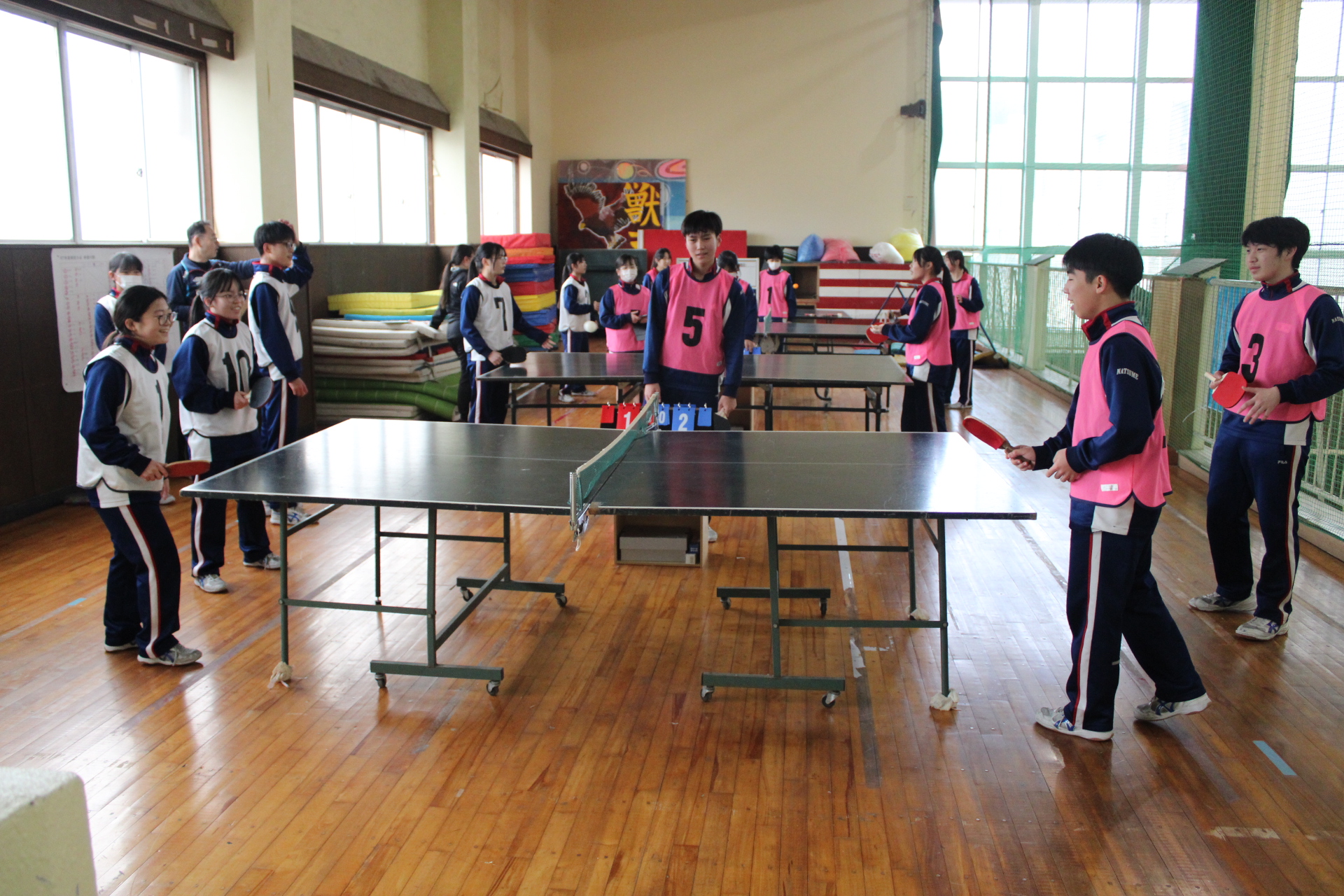 縦割りチーム対抗のバスケットボールと卓球で盛り上がりました。