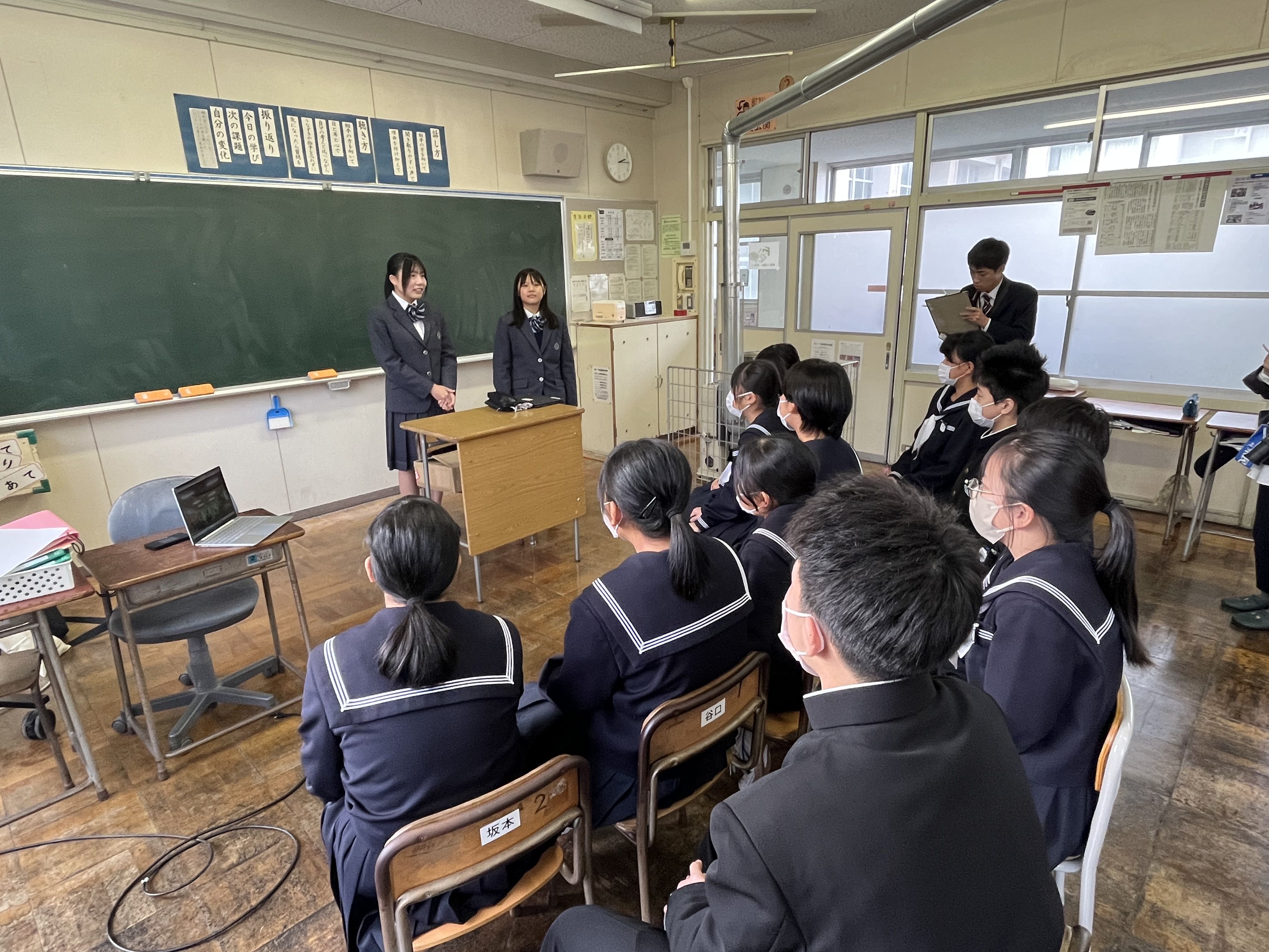 総合的な学習発表会では、中学2年生が職場体験学習について発表しました。8名は1~2名に分かれてそれぞれ興味のある職場に依頼をし、2日間の体験を行いました。