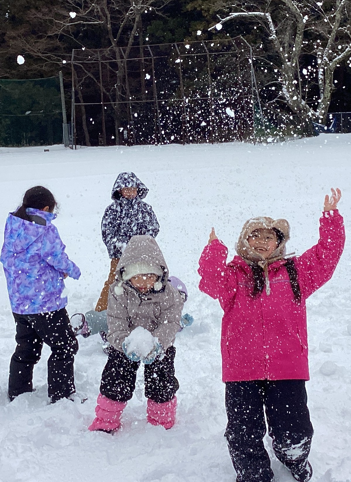 「わーい!」「気持ちいい!」「雪のシャワー!」