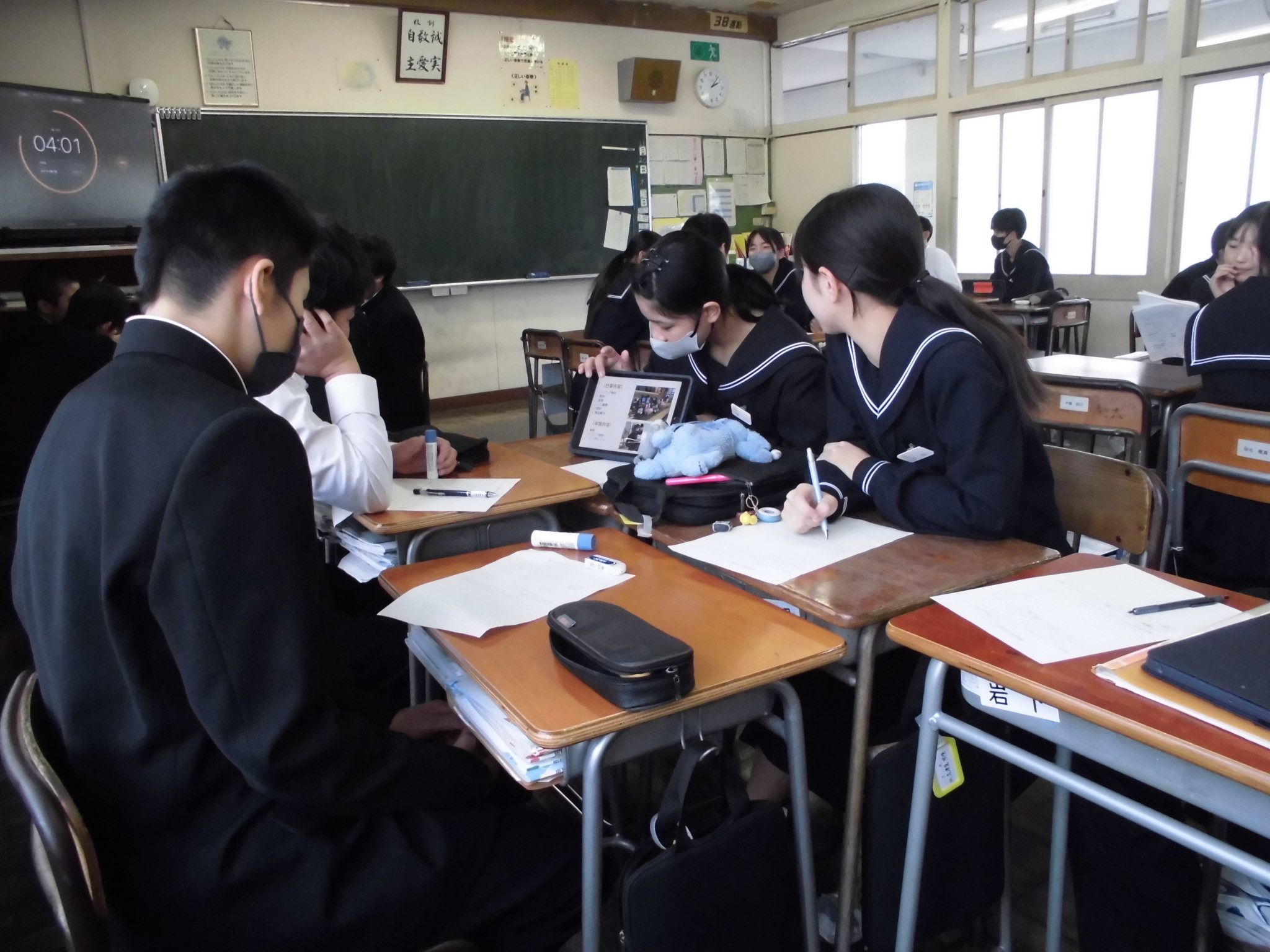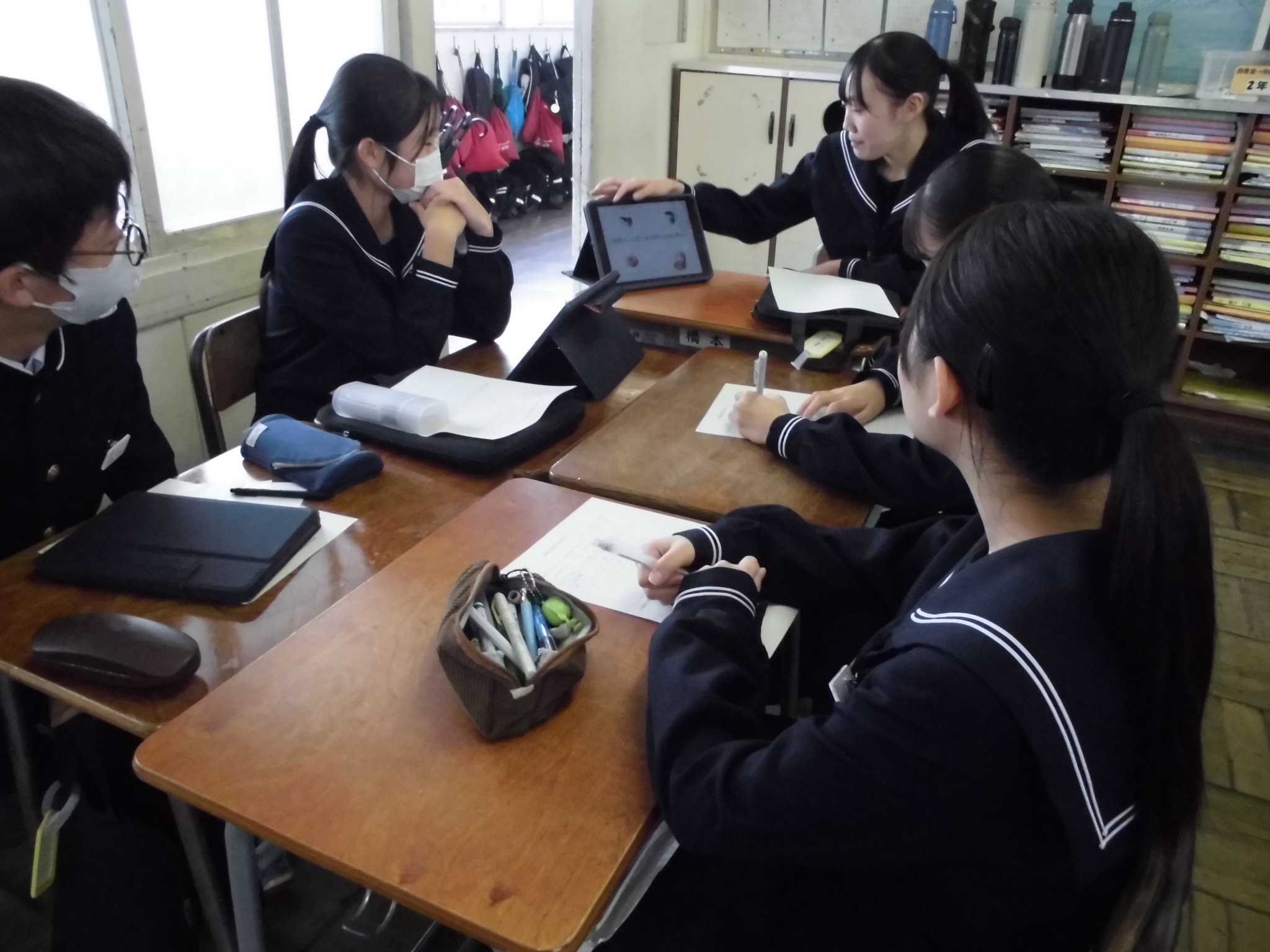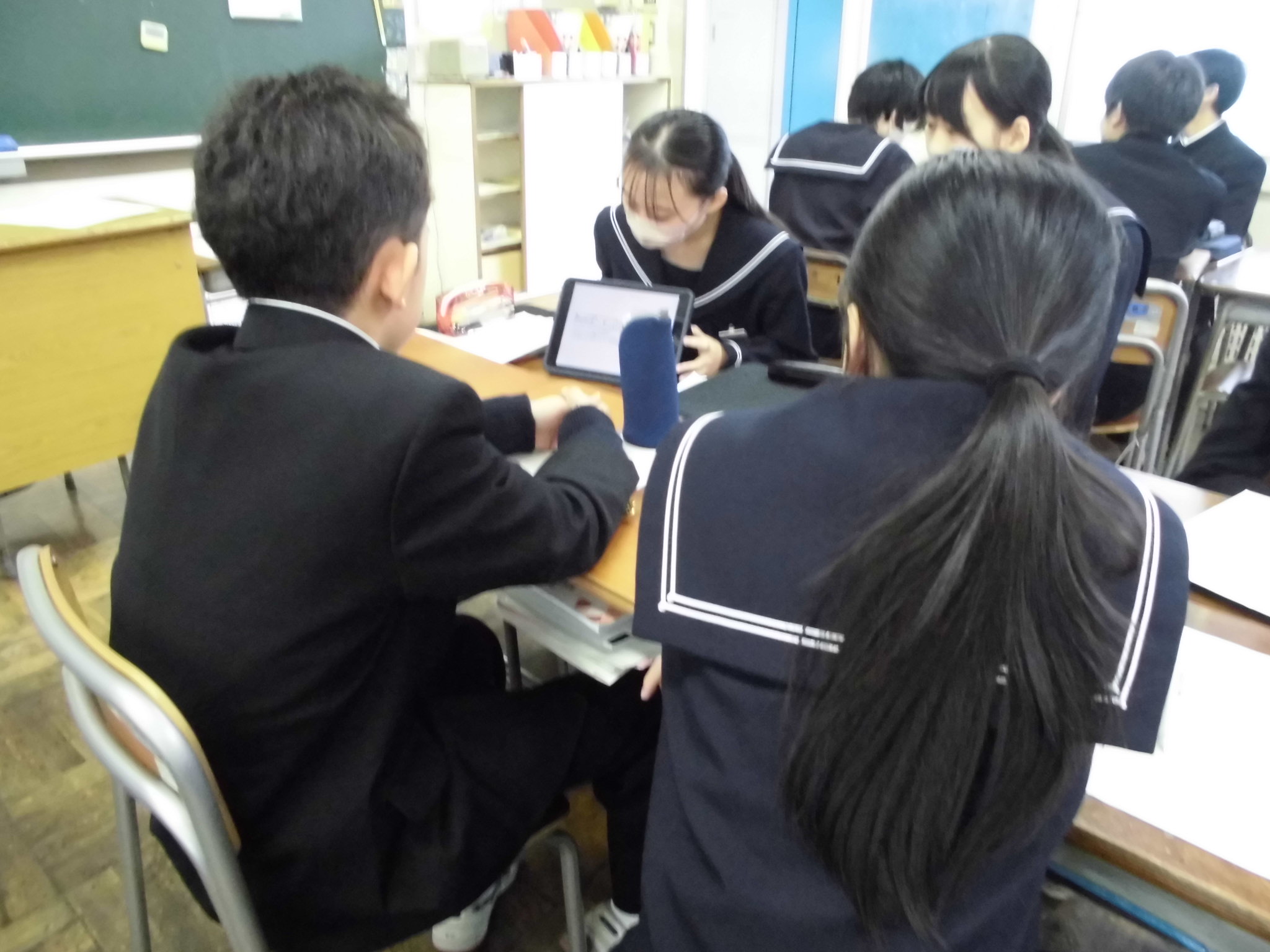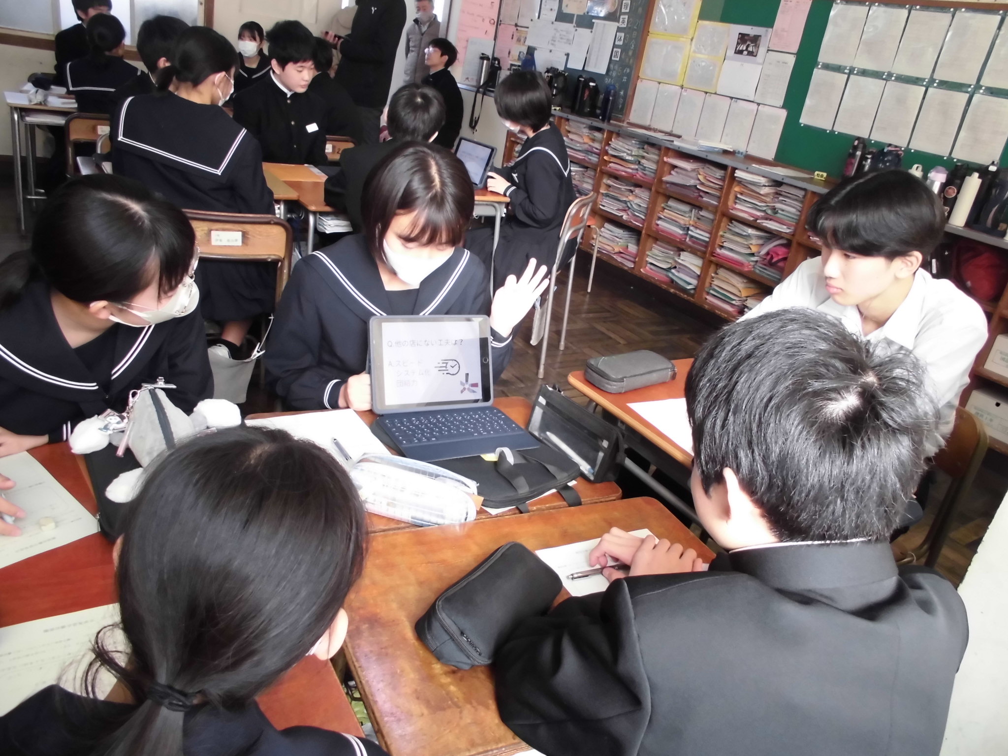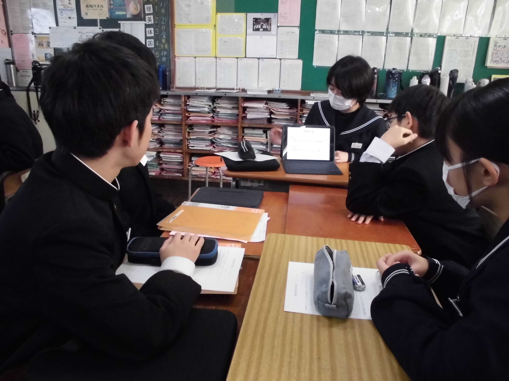 1年生と2年生で班を構成し、1年生は2年生の発表を熱心に聞いてメモを取っていました。