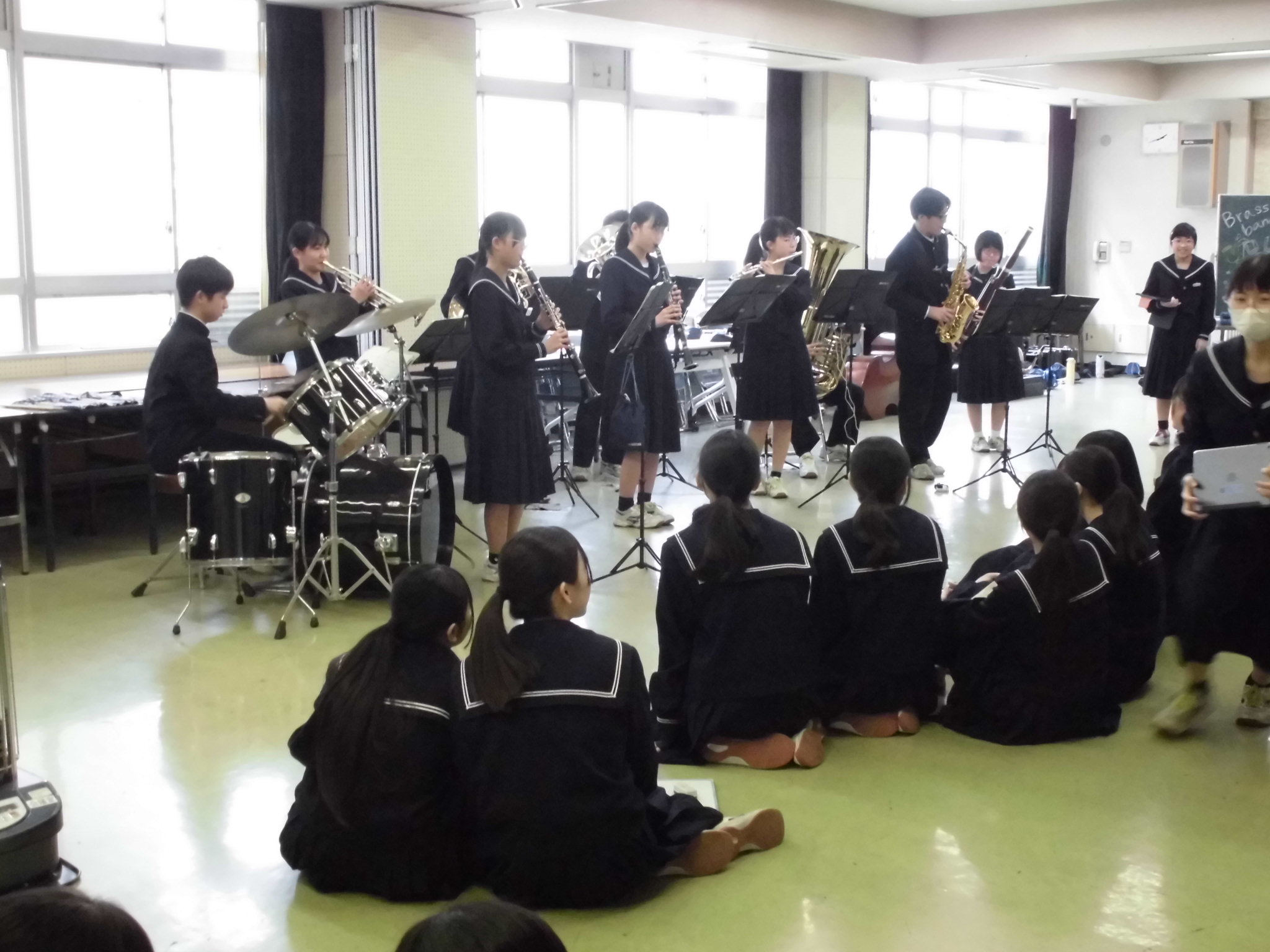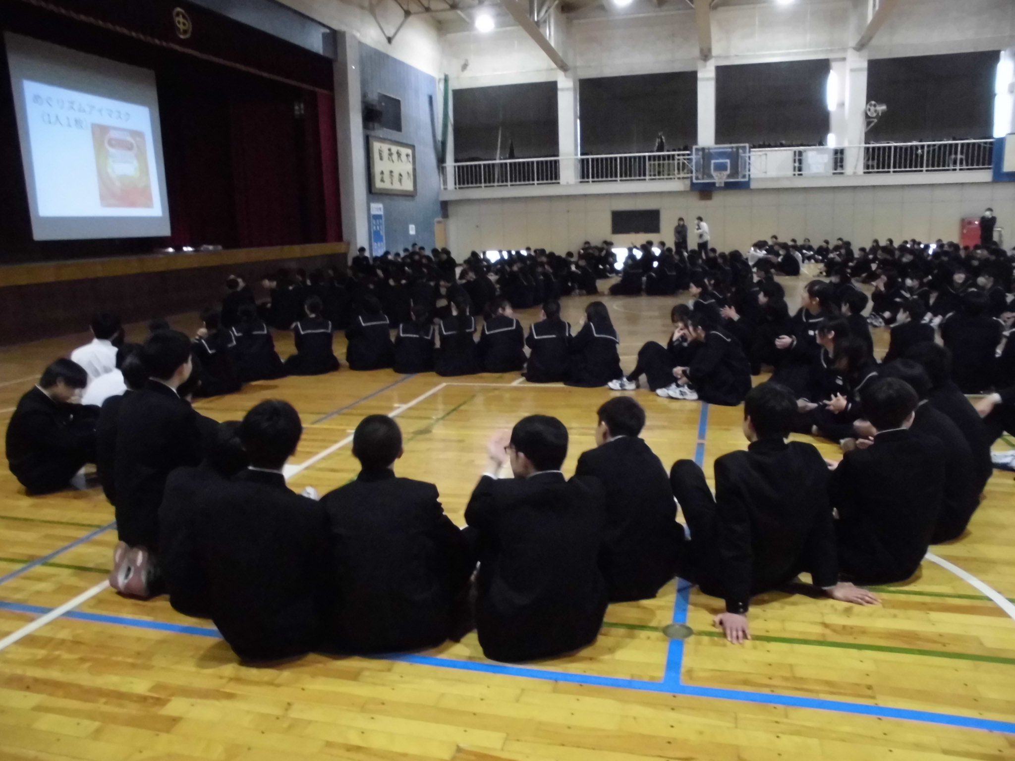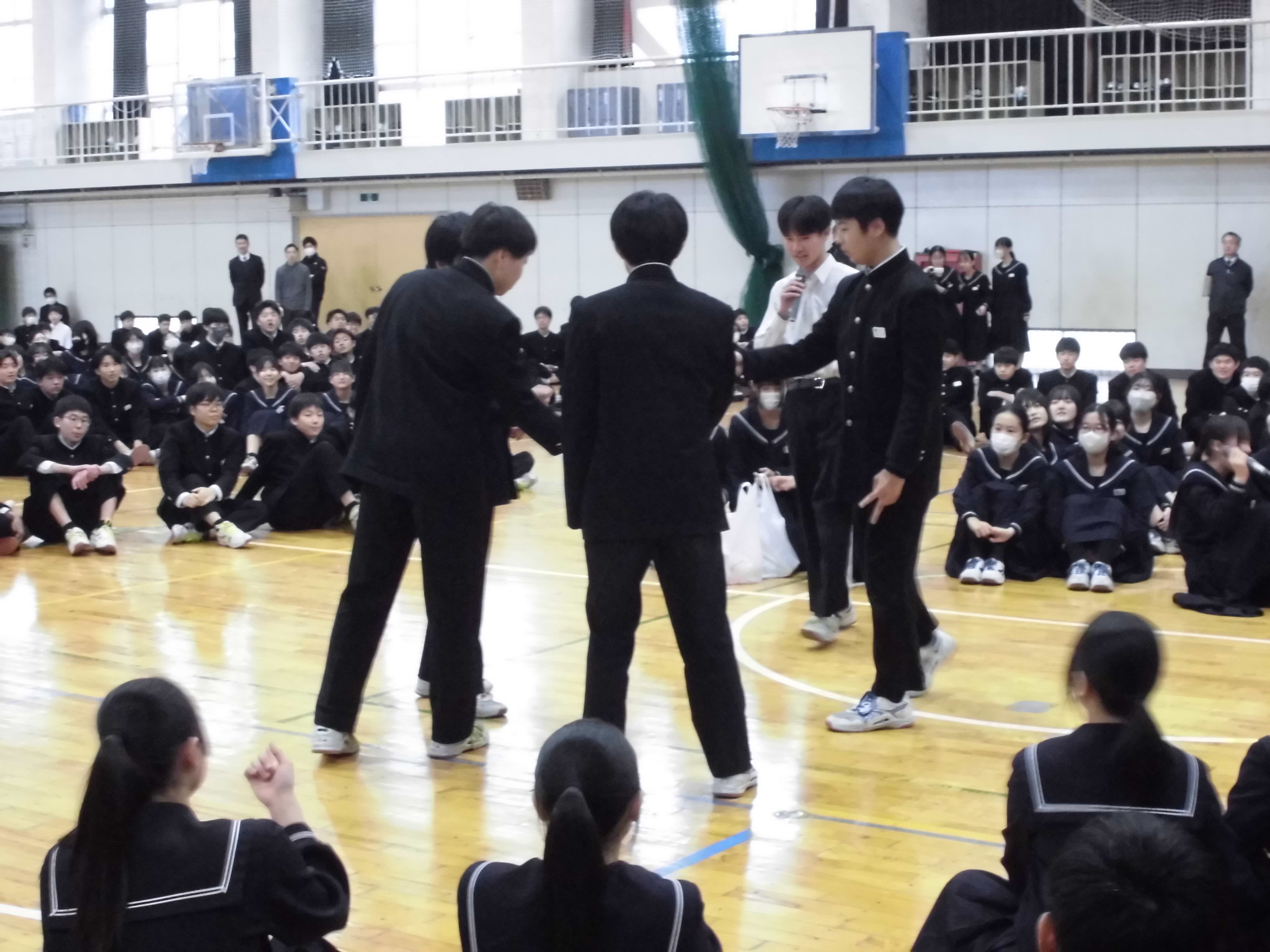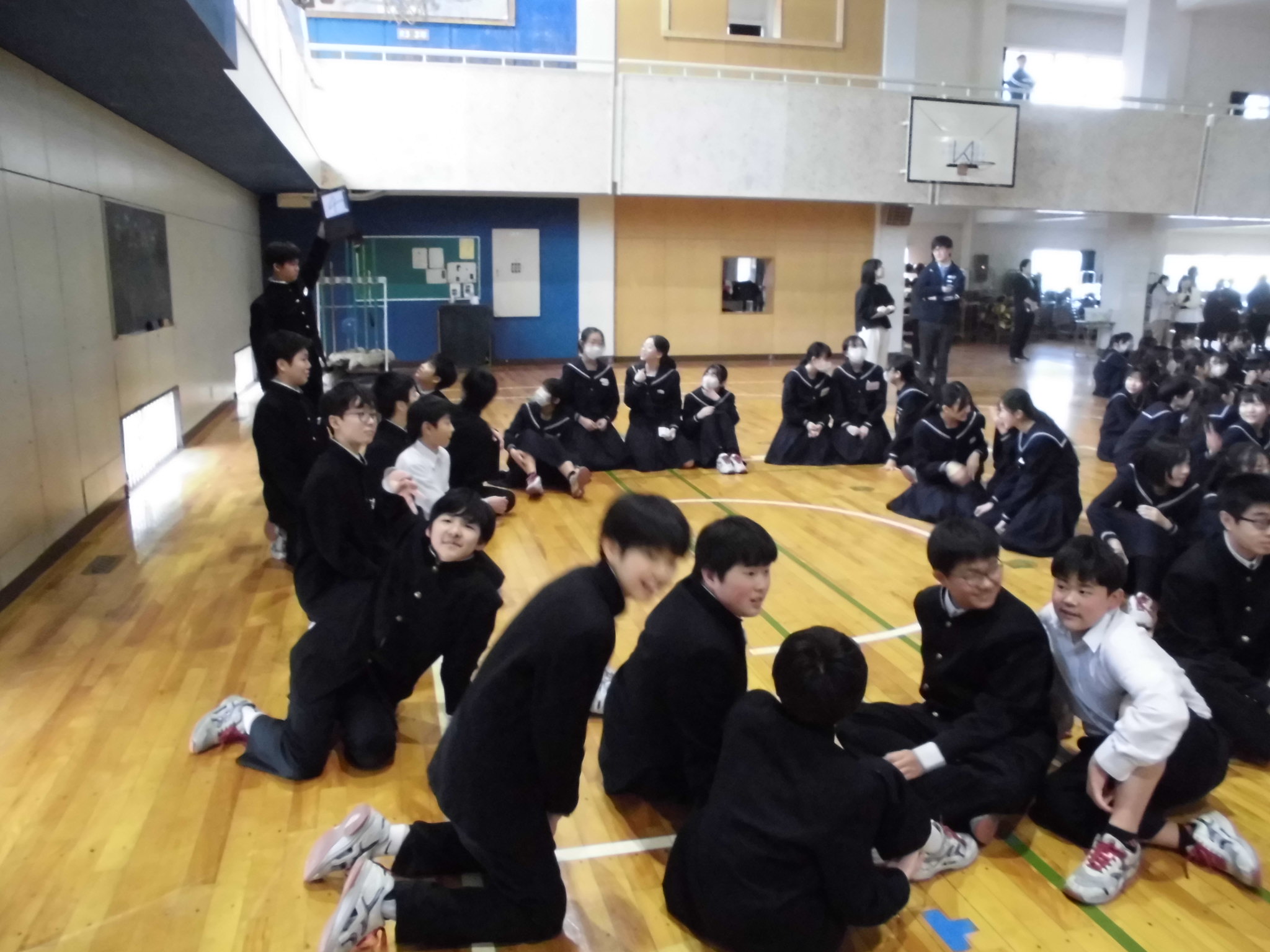 | 今日の1,2限には、卒業式の練習がありました。 とても素晴らしい姿勢で臨め、歌声も素晴らしかったですね。 今日の6限目には、2年生が体育館に集まりました。 卒業式に向けて |