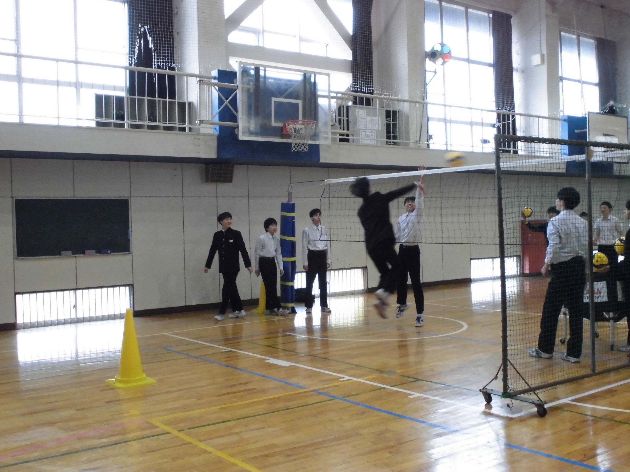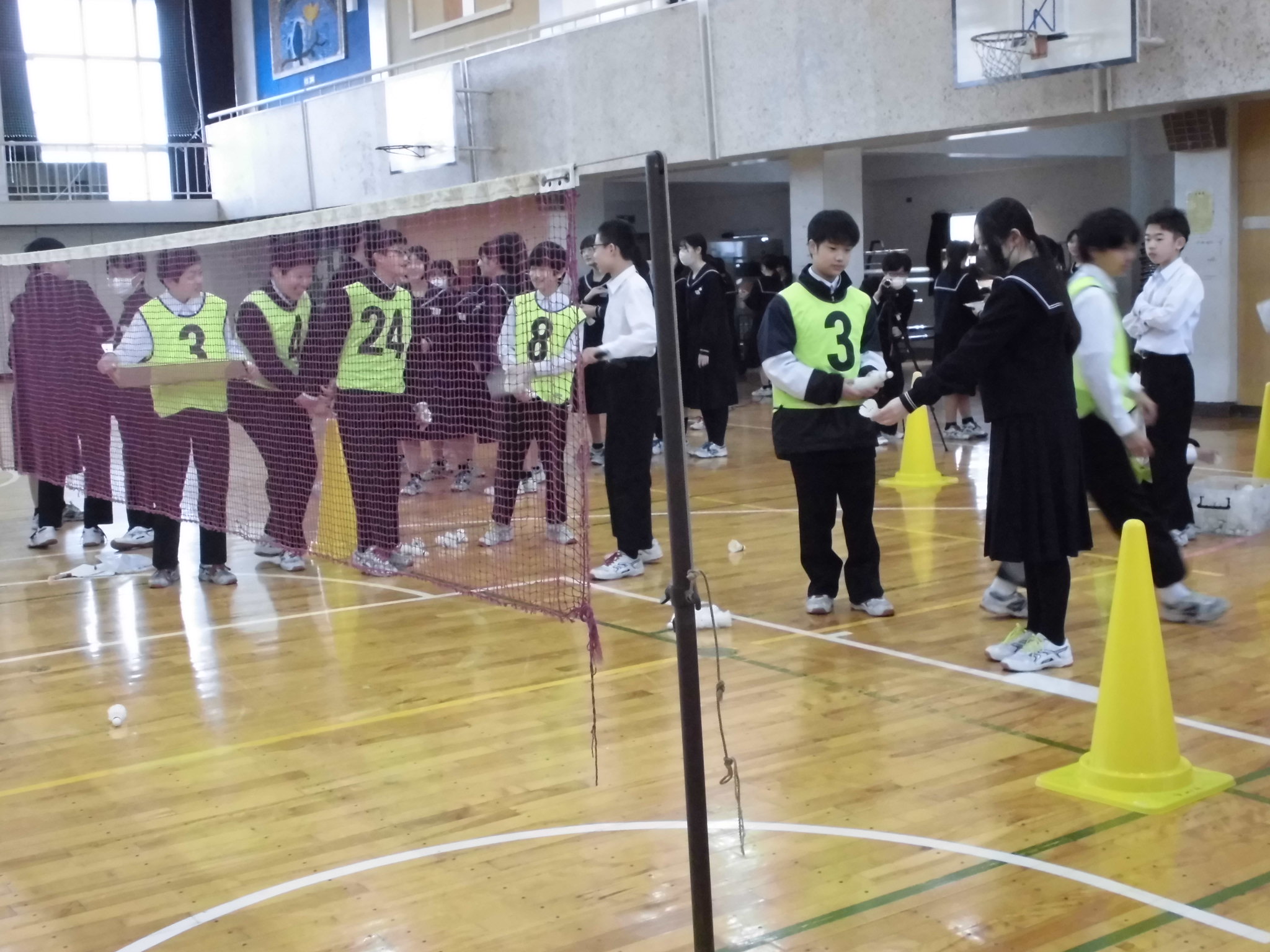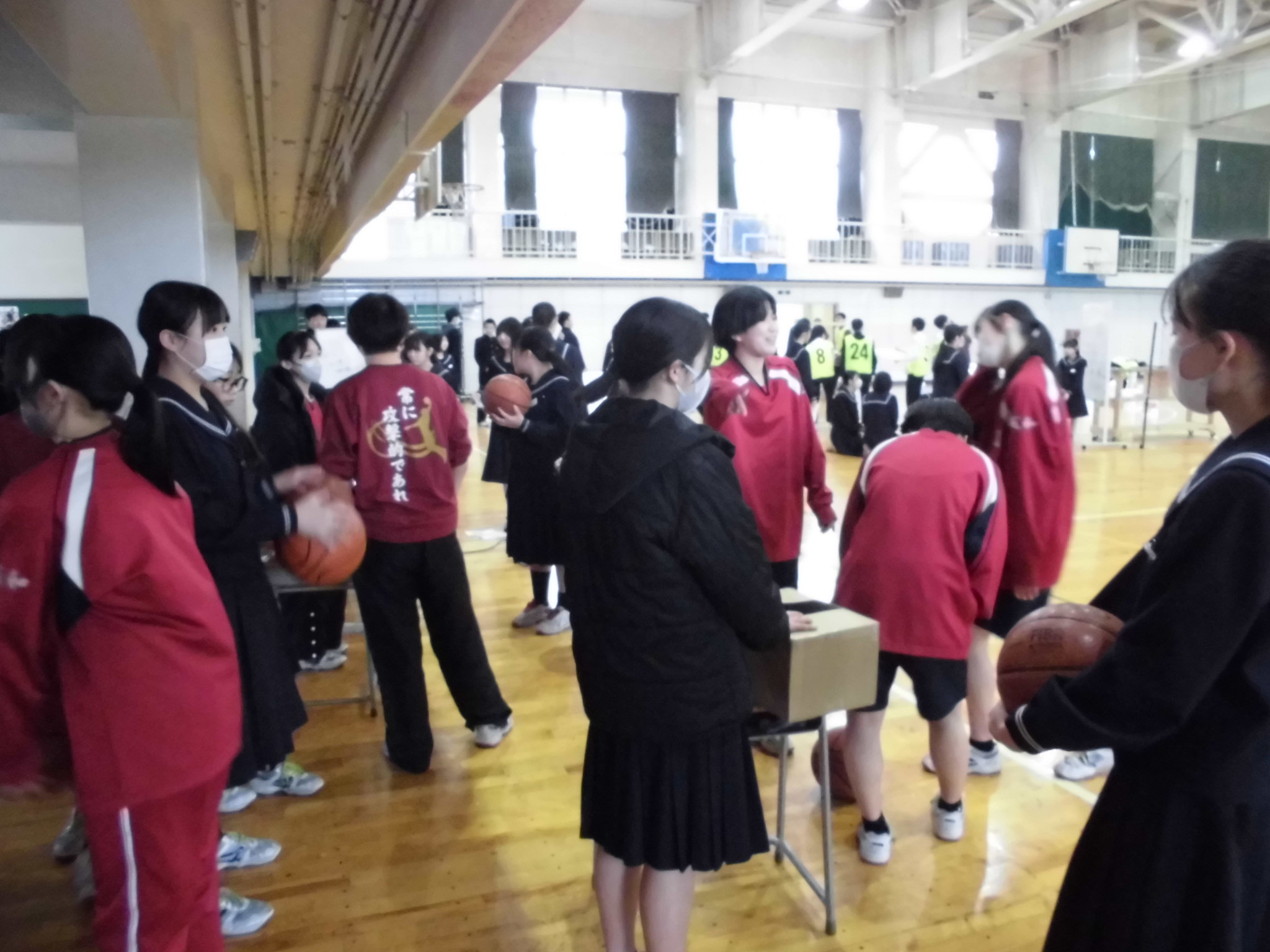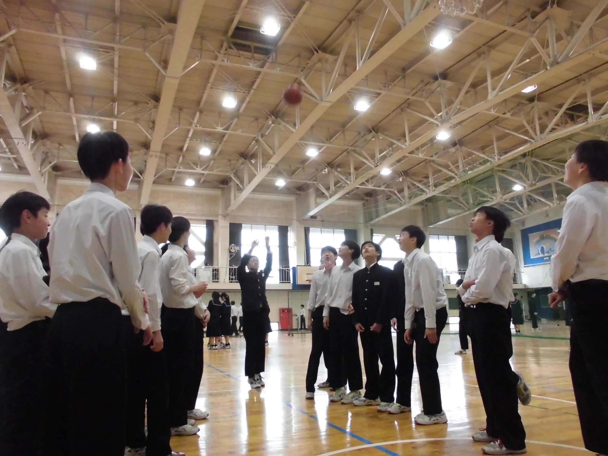 | 例年、年度末に行われる球技大会(1年生:3/19、2年生:3/23)に向けて、クラスごとに昼休みの体育館練習が割り当てられています。 シュート練習をしている生徒がほとんどです |