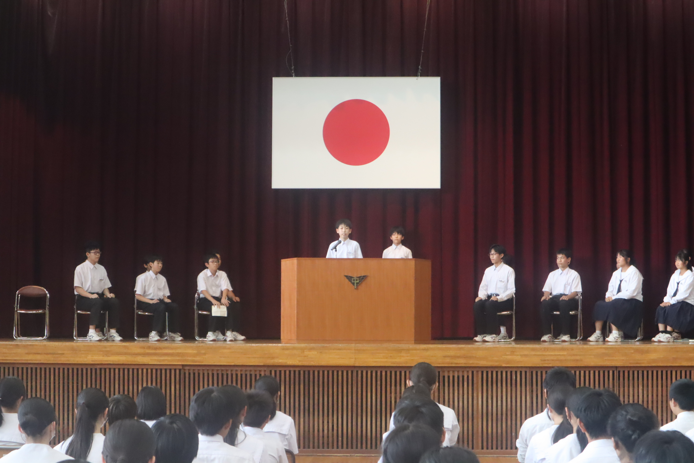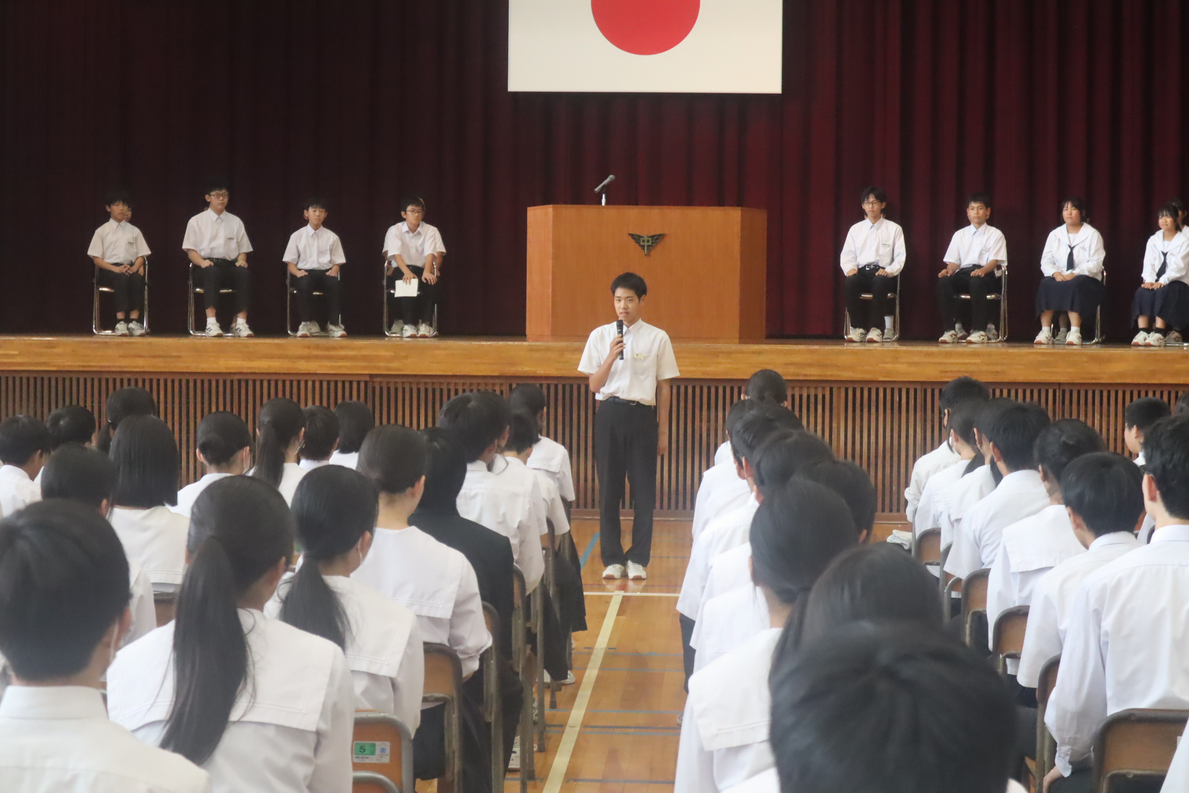 | 秋休みが終わり、2学期がスタートしました。 10月15日(水)は2学期始業式、認証式が行われました。 生徒会も新しい役員が認証され、1学期生徒会長から生徒会旗が引き継が |