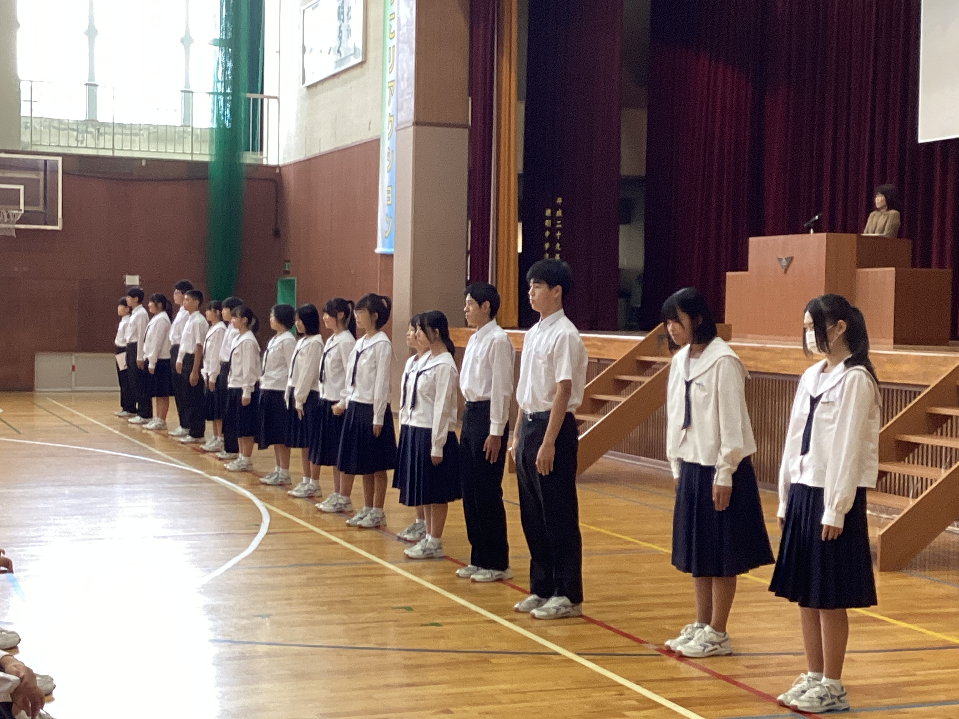 | 地区秋季新人大会にむけて壮行会が行われました。 文化部からは、今後の活動への意気込みが報告されました。 また、駅伝チームは地区大会の報告と県大会への決意が発表されました |